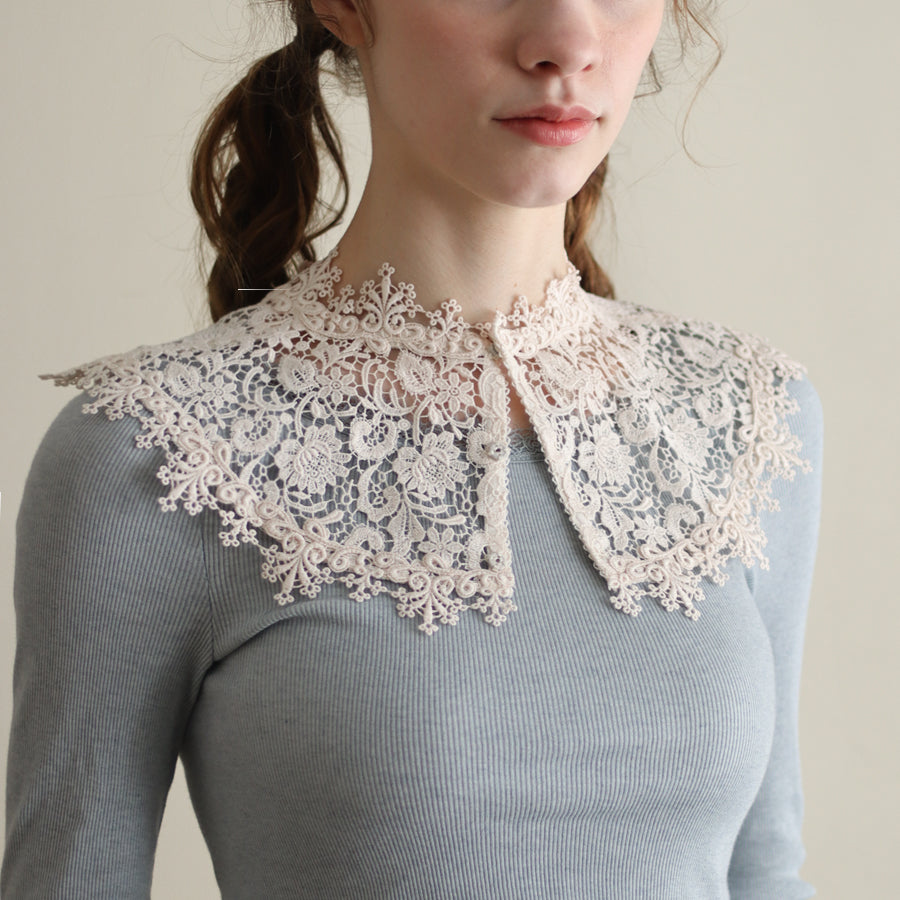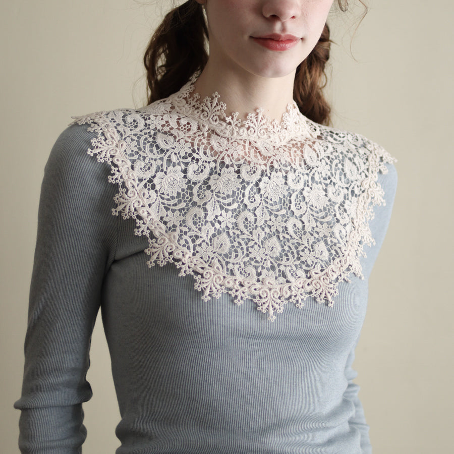 シンプルなお洋風に重ねると、お顔まわりを華やかに演出してくれます。