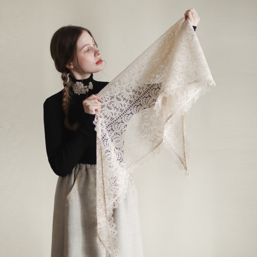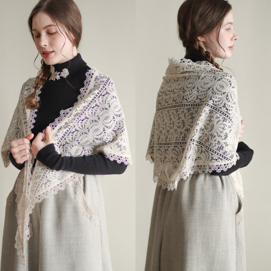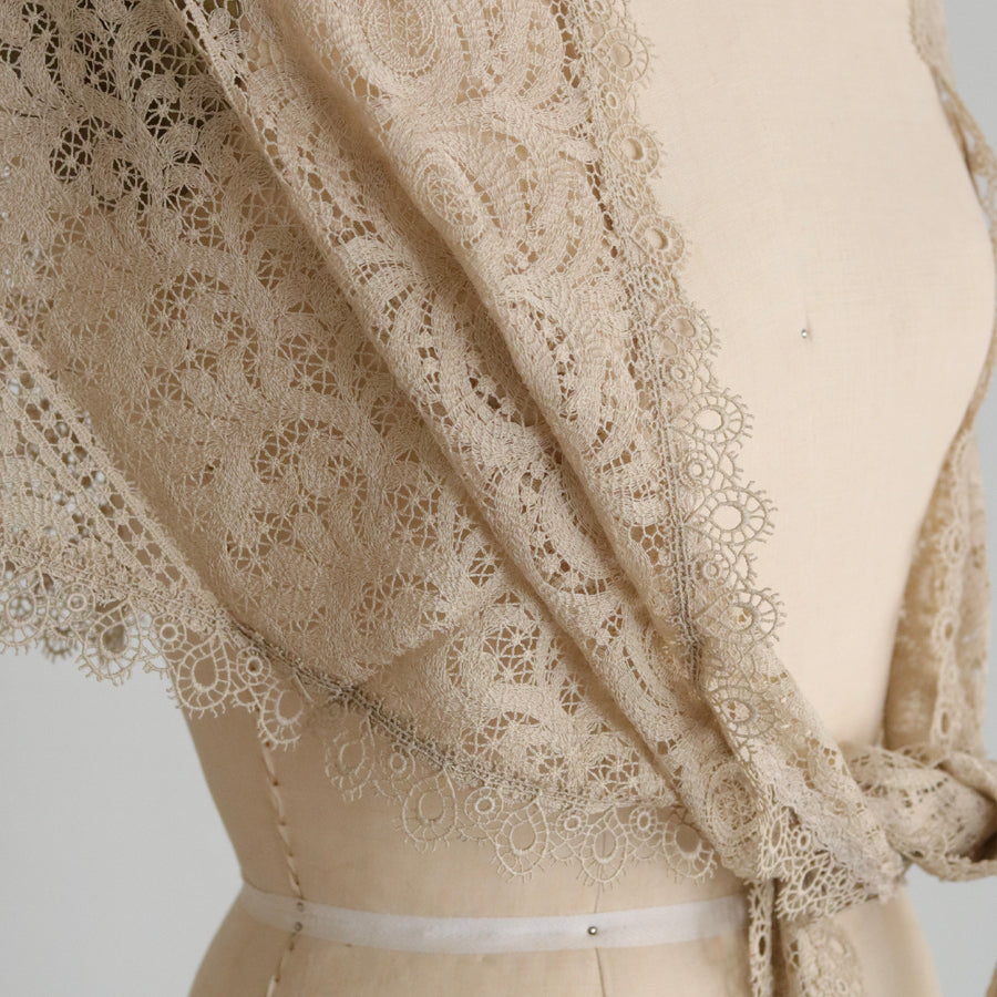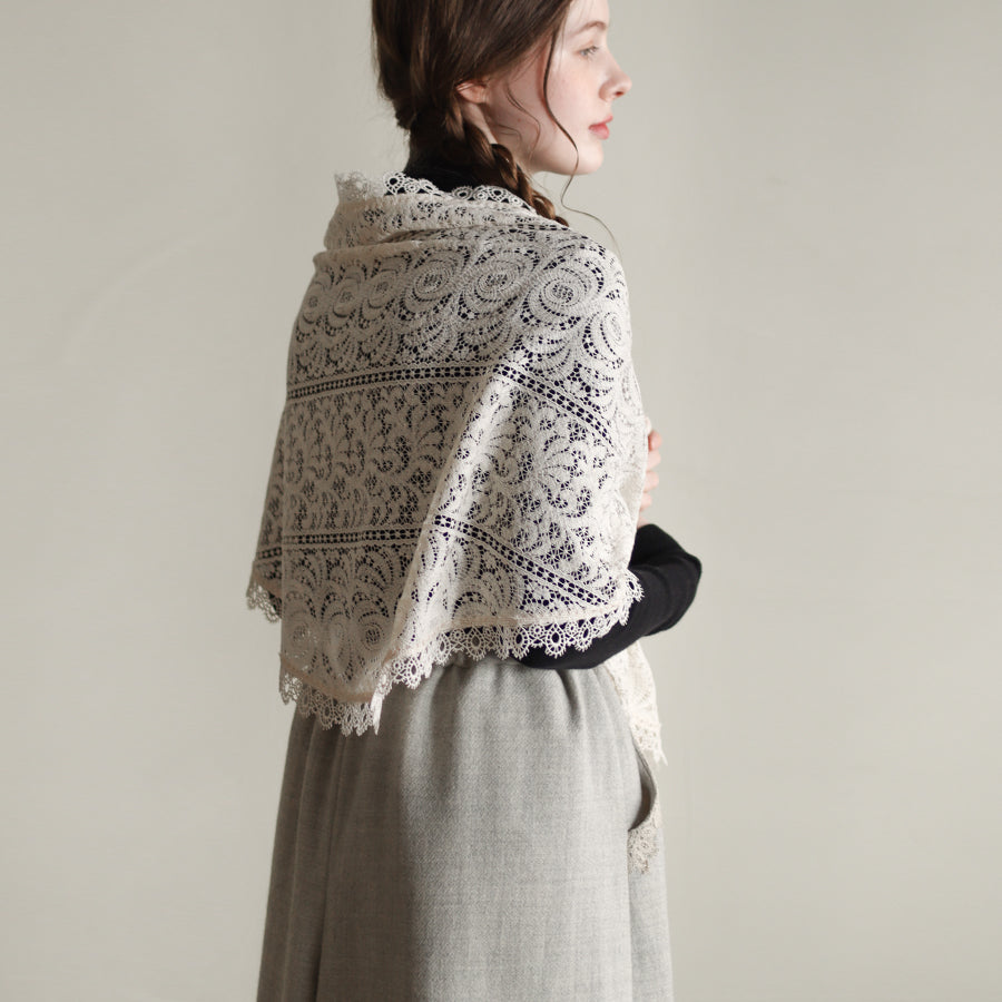 オリジナルレース「縞模様ケミカル」を使用した三角ストール。