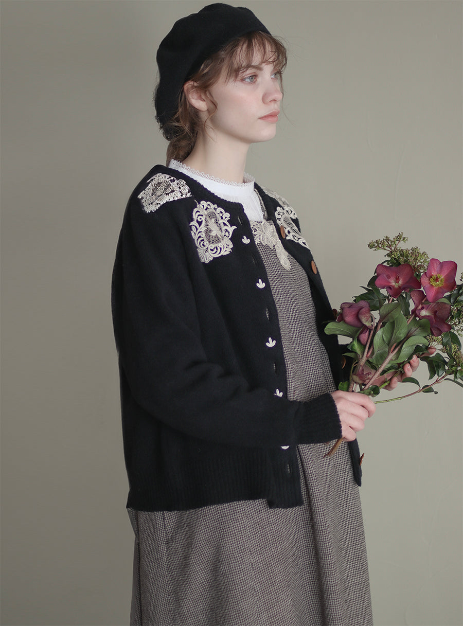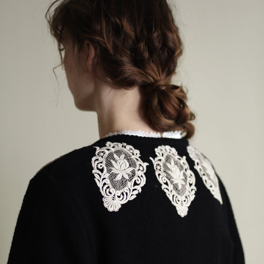 ループヤーンのふんわりと軽やかな着心地、首周りを装飾した存在感のあるレースエンブレムもポイント。