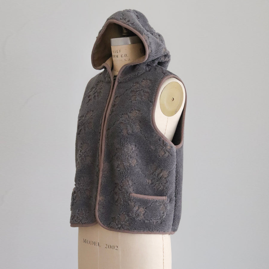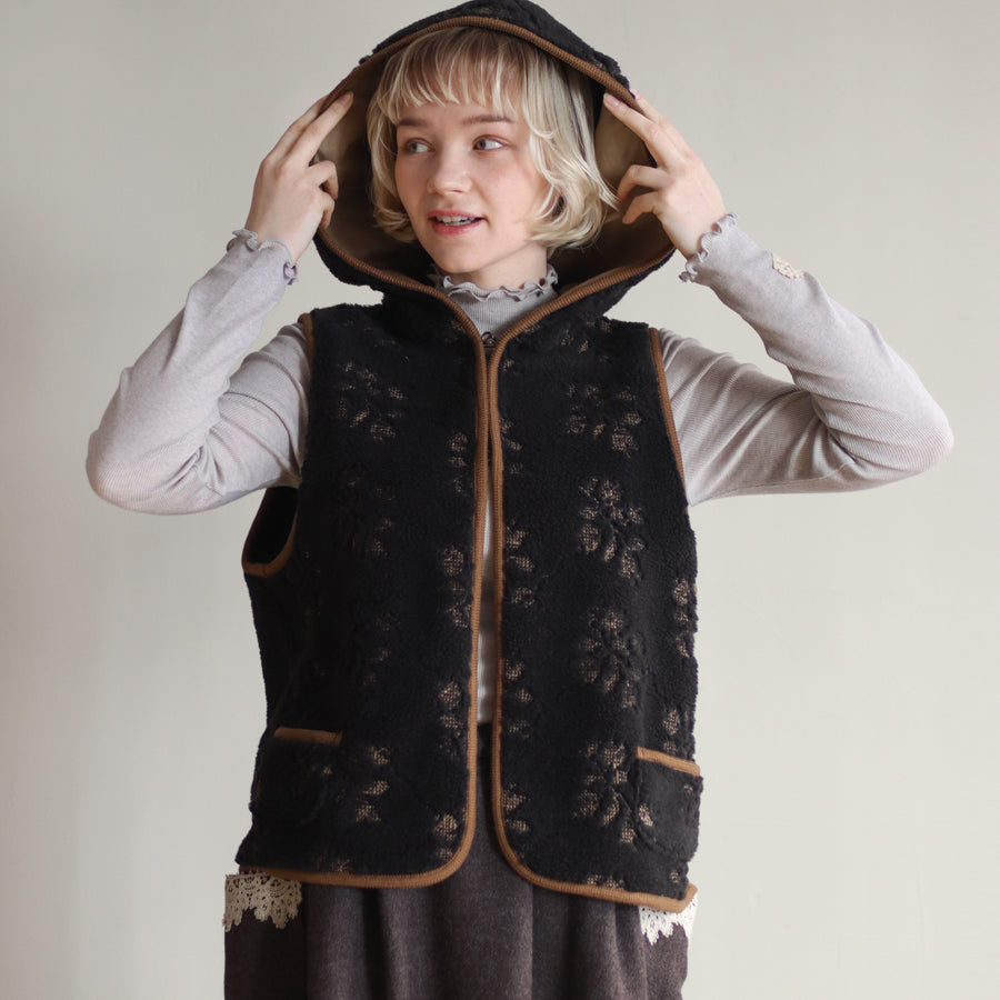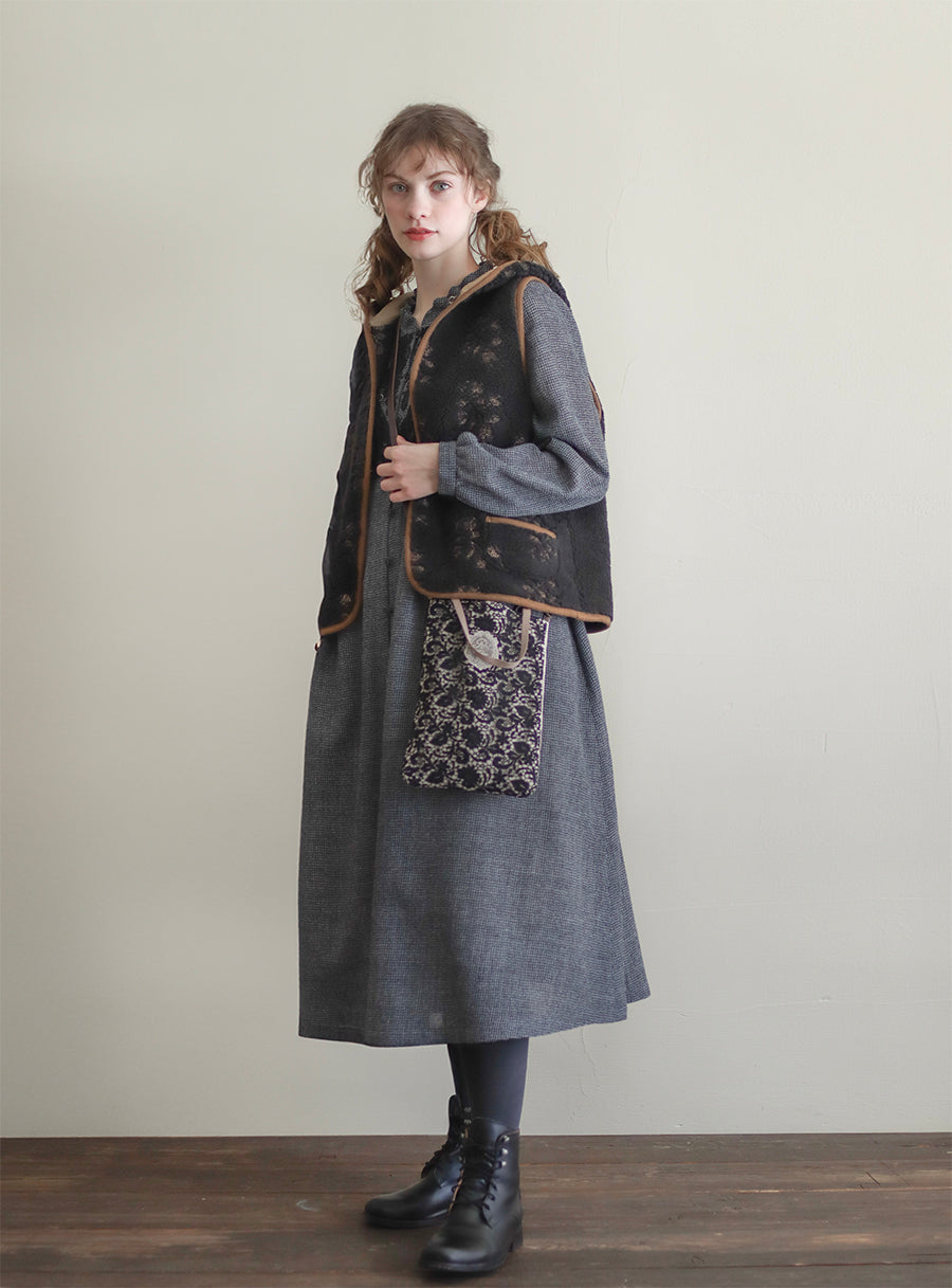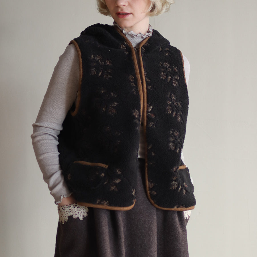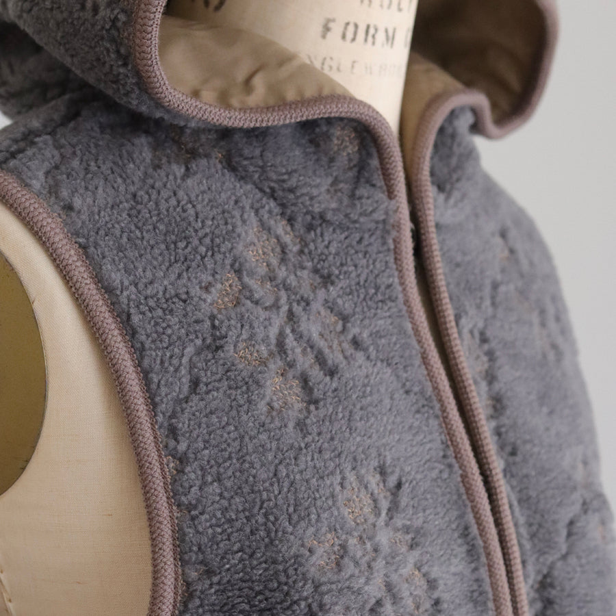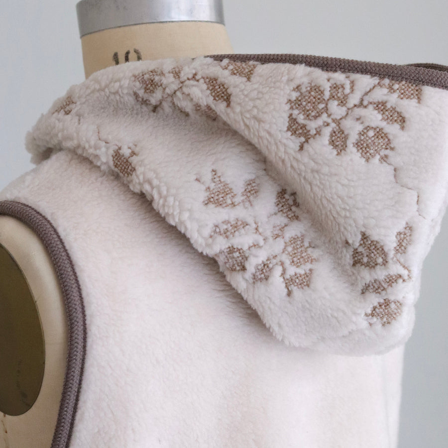軽やかなファー素材にクロスステッチ柄で刺繍をかけたオリジナルテキスタイル「もこもこクロスステッチ刺繍」のベスト。
