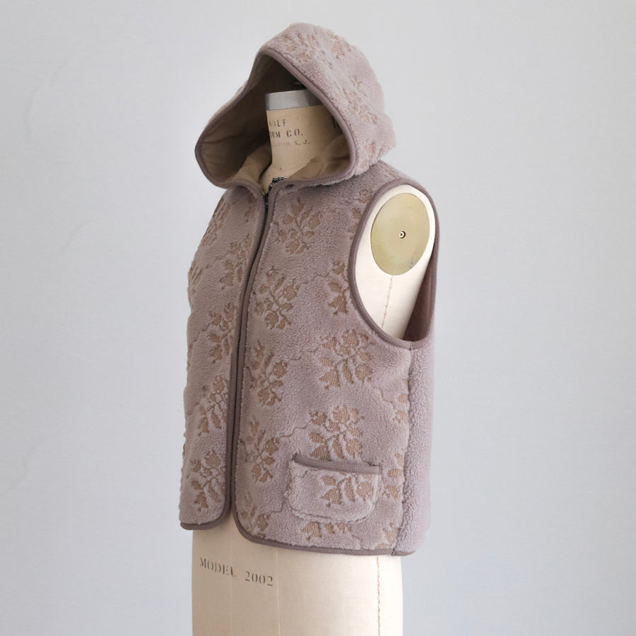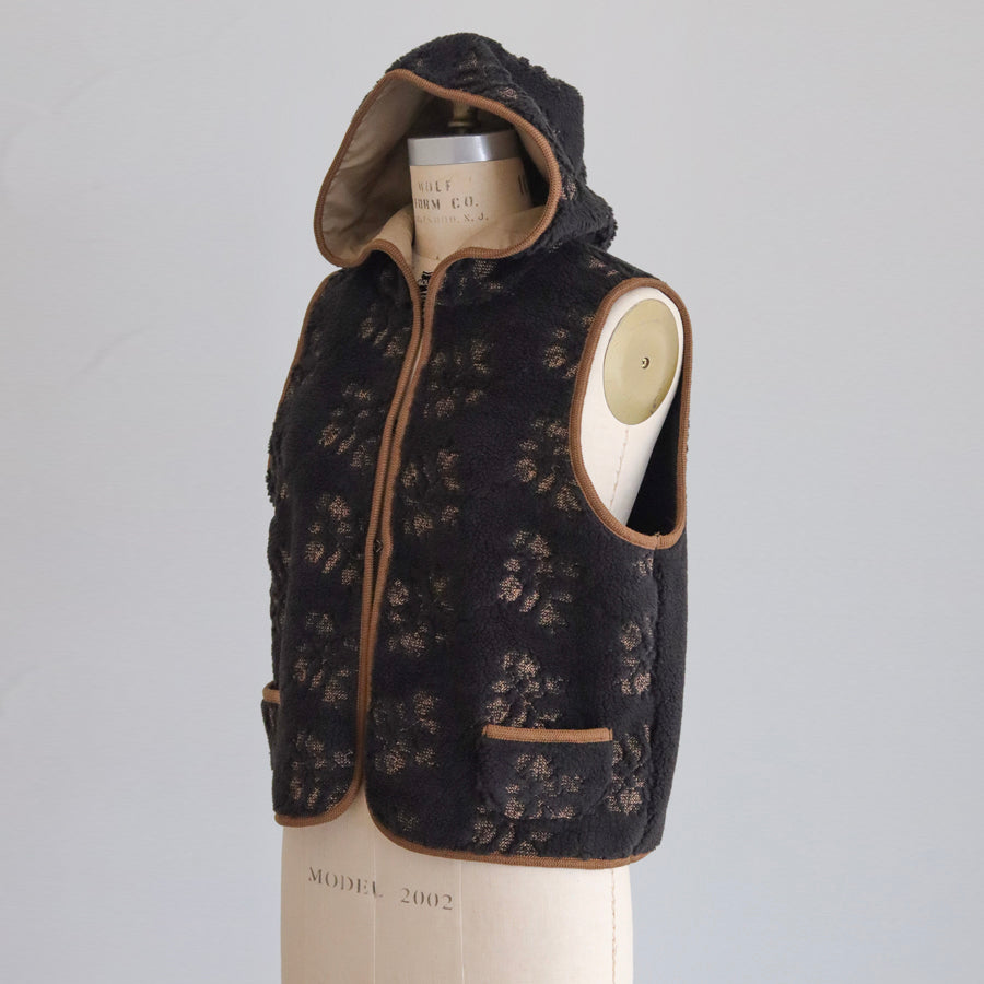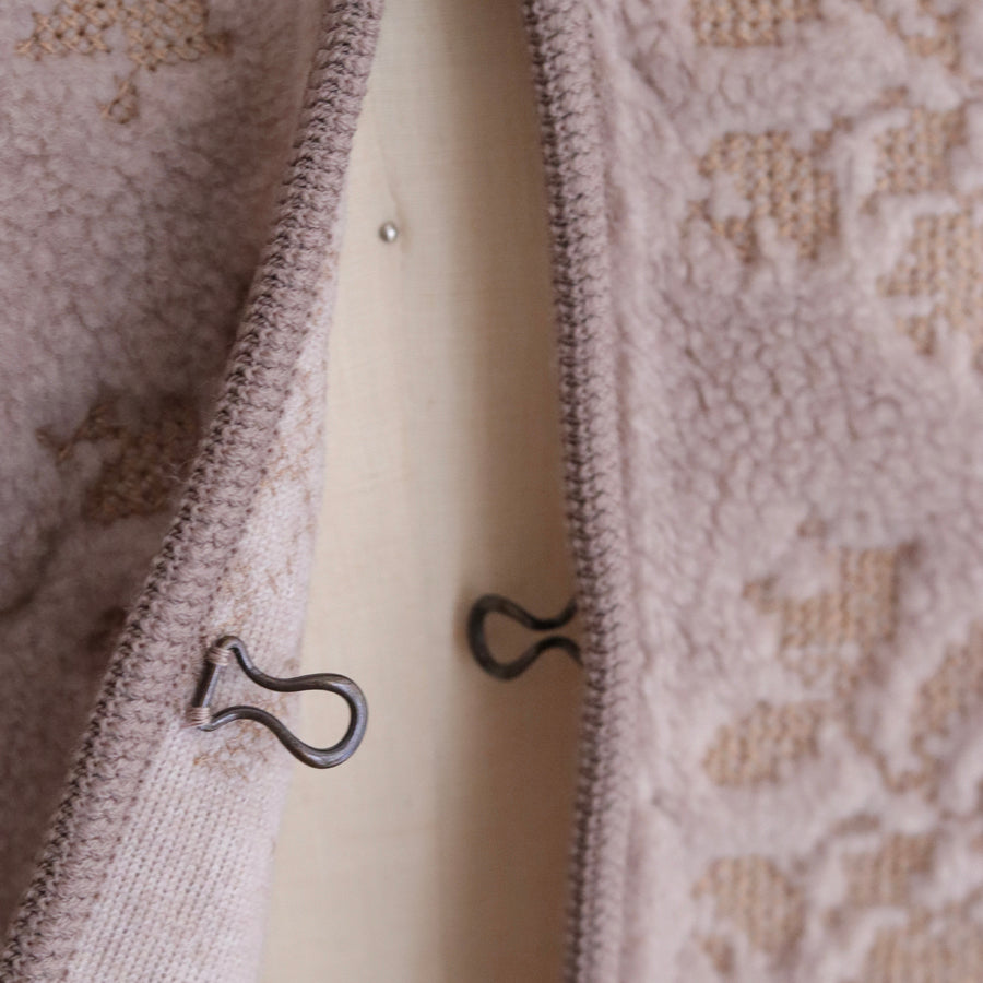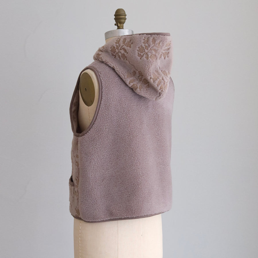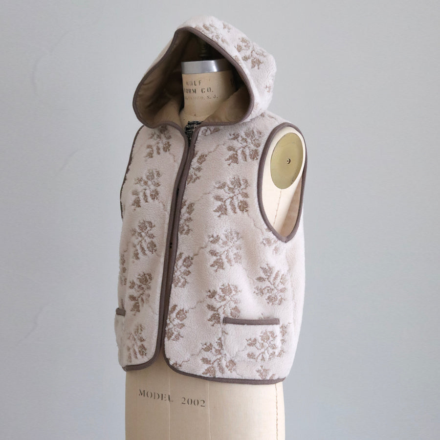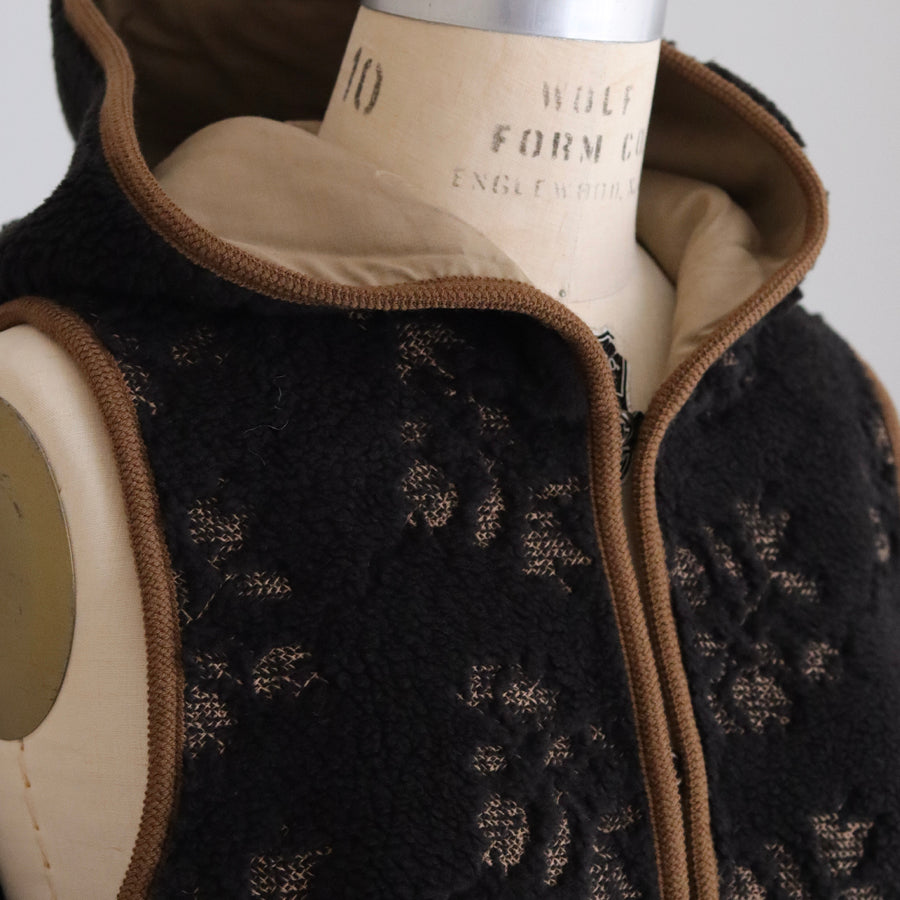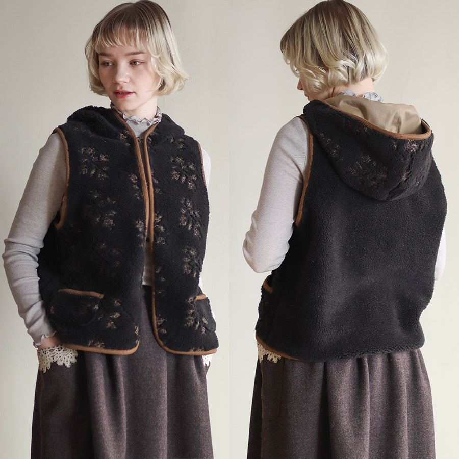 軽やかなファー素材にクロスステッチ柄で刺繍をかけたオリジナルテキスタイル「もこもこクロスステッチ刺繍」のベスト。