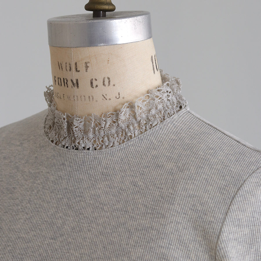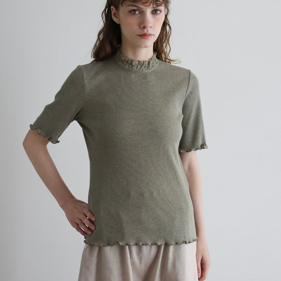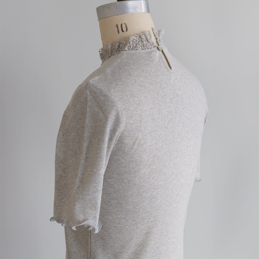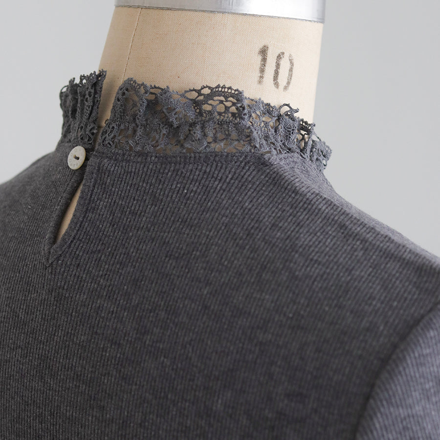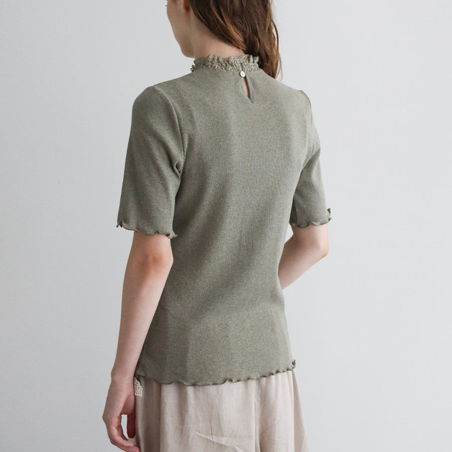 良質で肌ざわりのやわらかな素材感の四分袖インナーです。締め付けのない伸縮性のあるレースを首元に配置し、シンプルながら着回ししやすい一着に仕立てました。