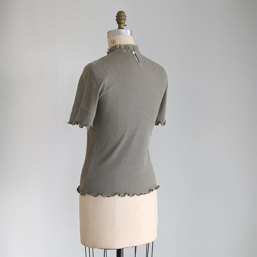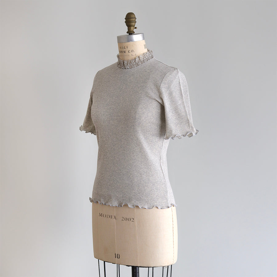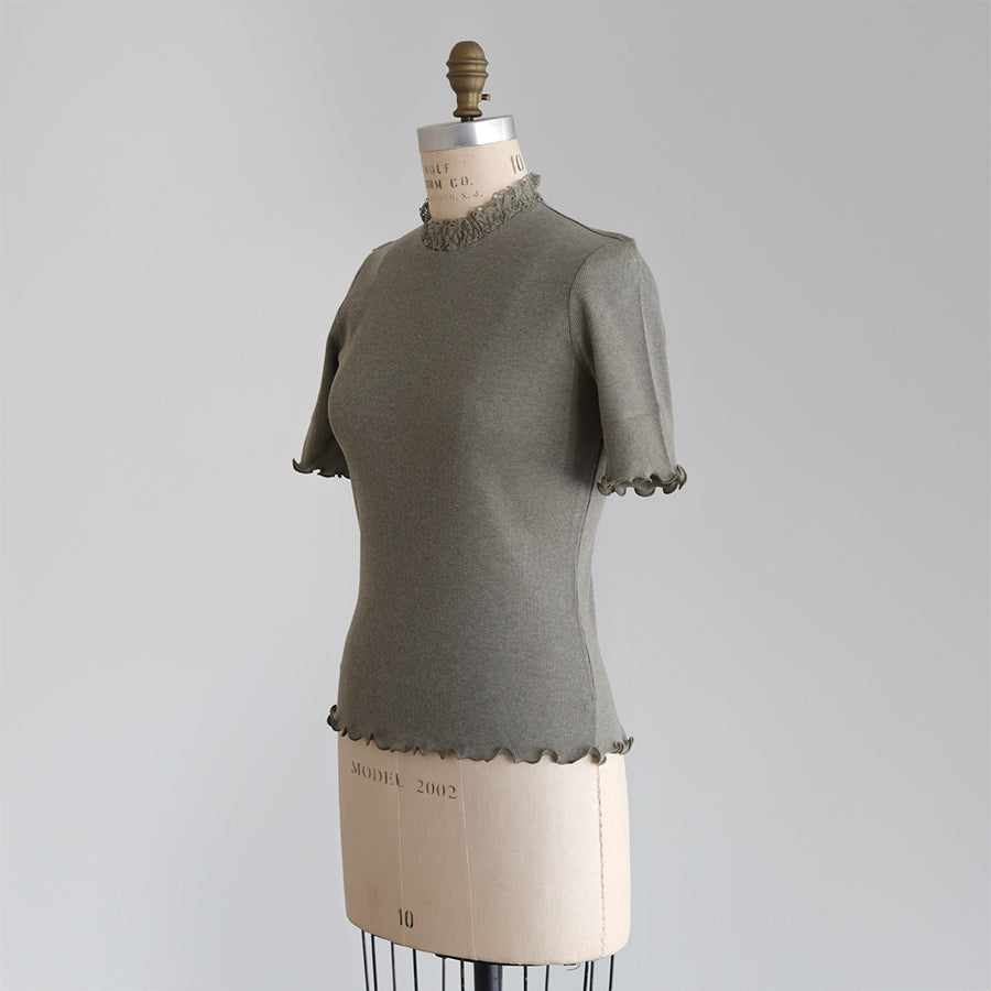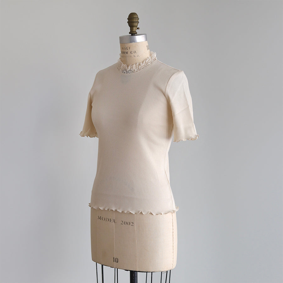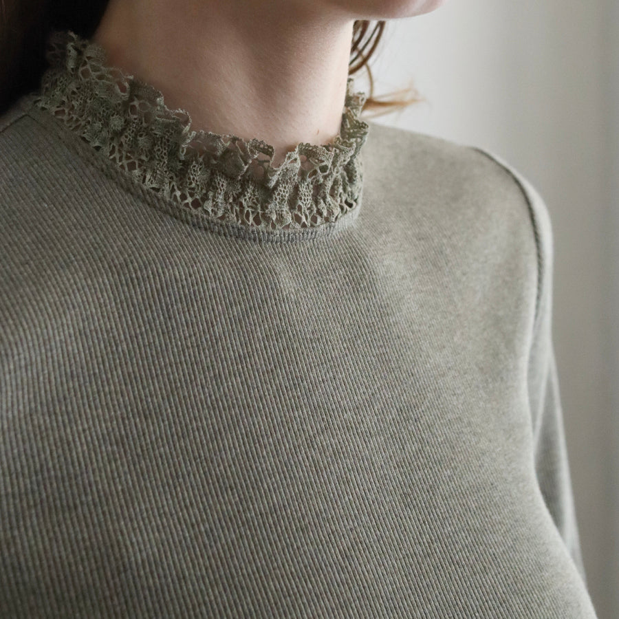 良質で肌ざわりのやわらかな素材感の四分袖インナーです。締め付けのない伸縮性のあるレースを首元に配置し、シンプルながら着回ししやすい一着に仕立てました。