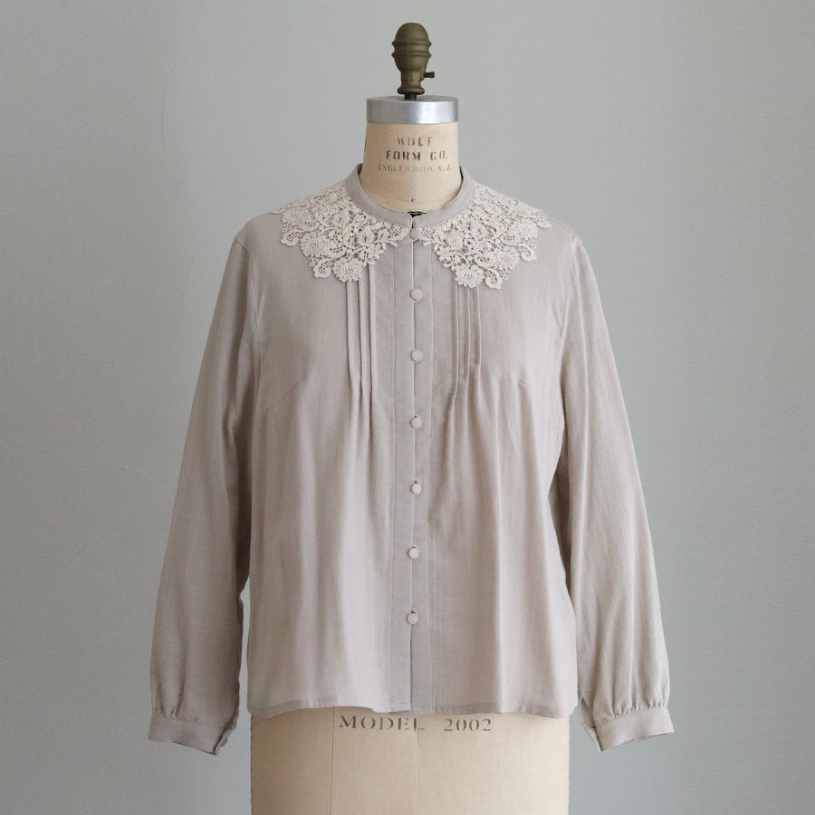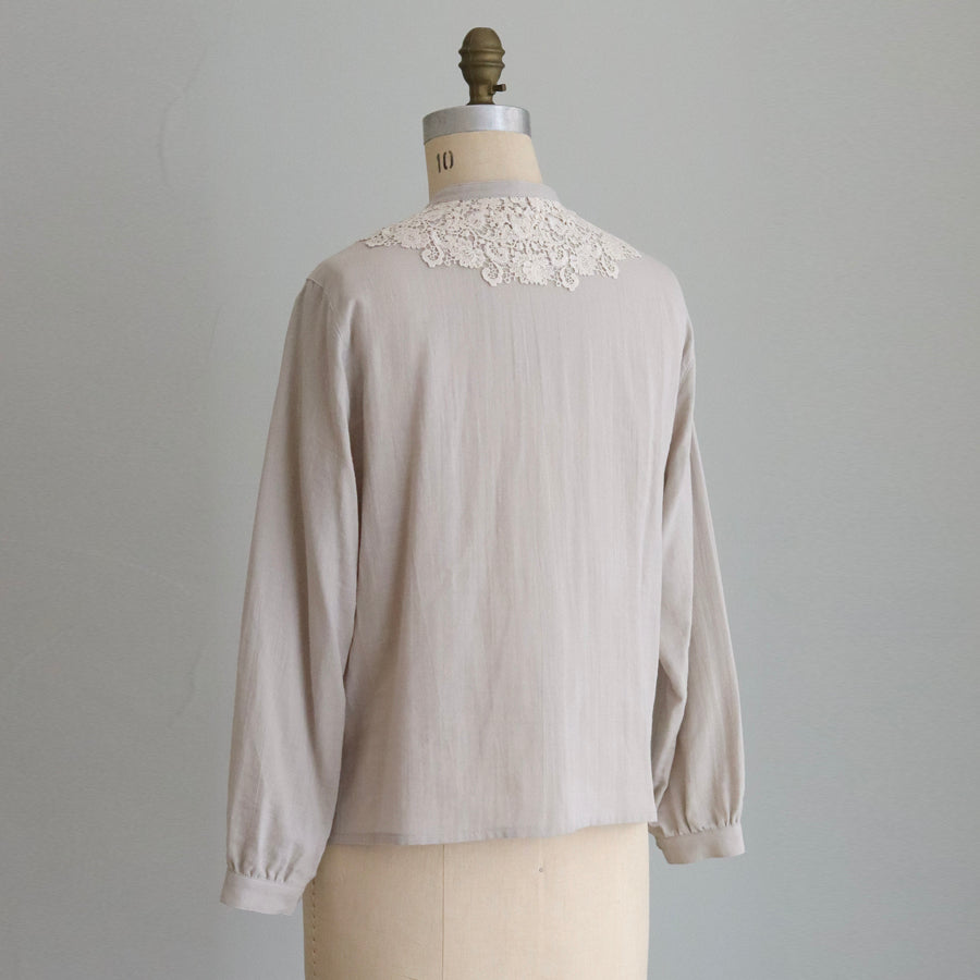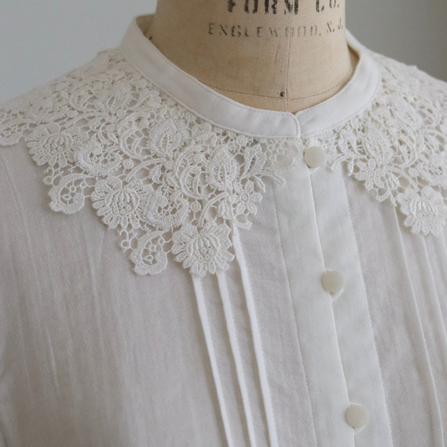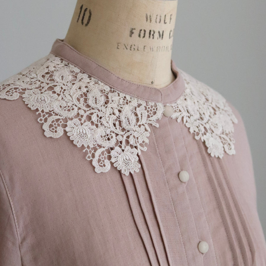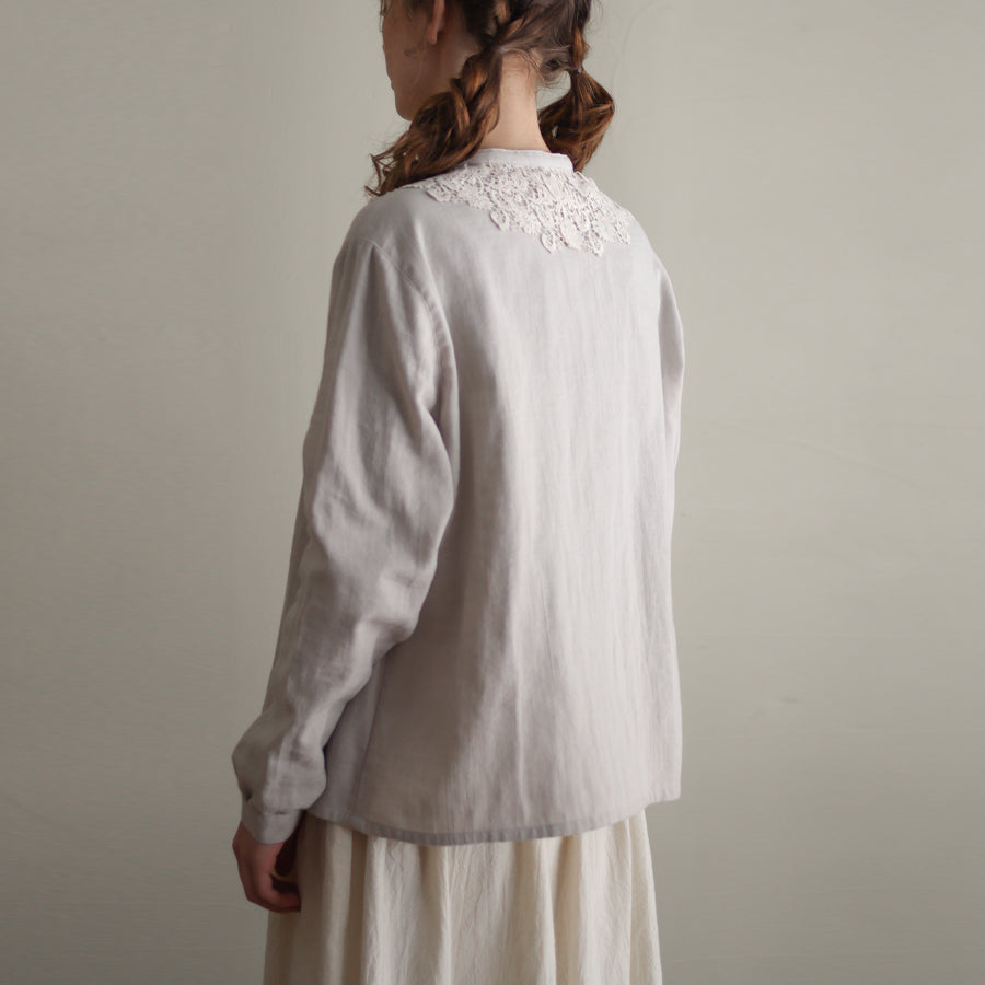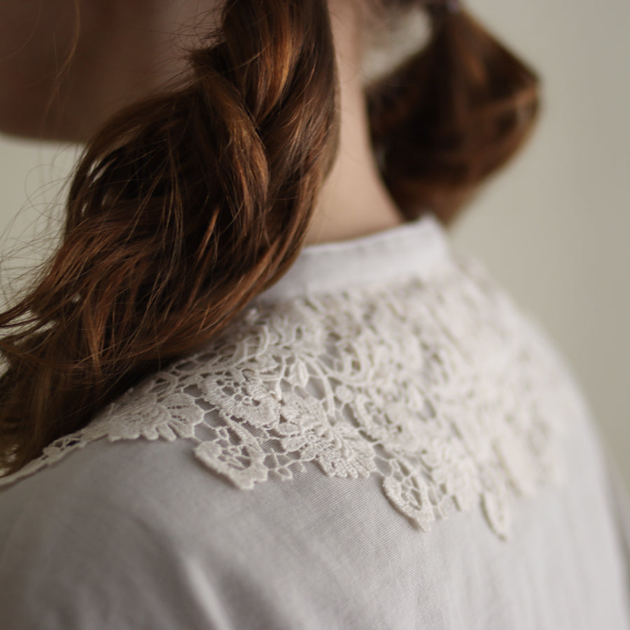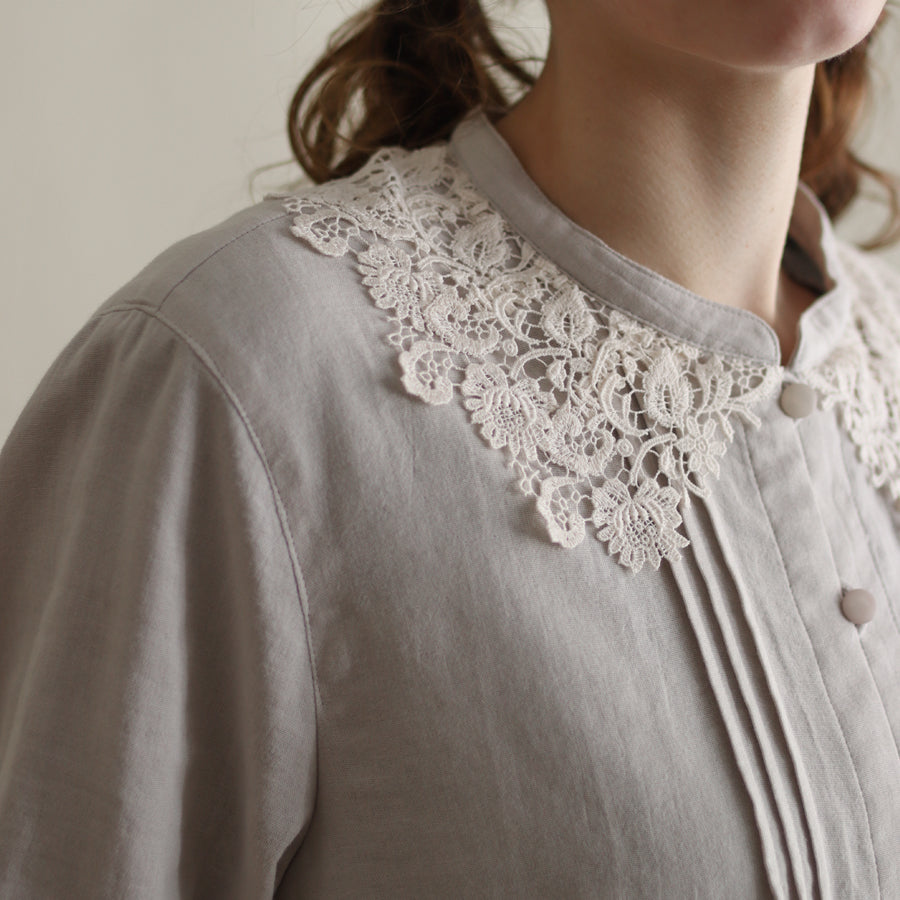 オリジナルレース「Anticoケミカル」に手仕事を加え、ハンドカットして襟のレースに仕立てました。