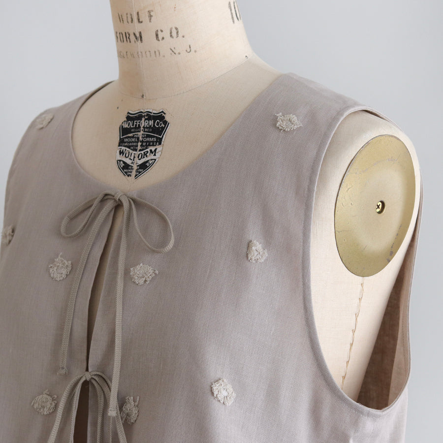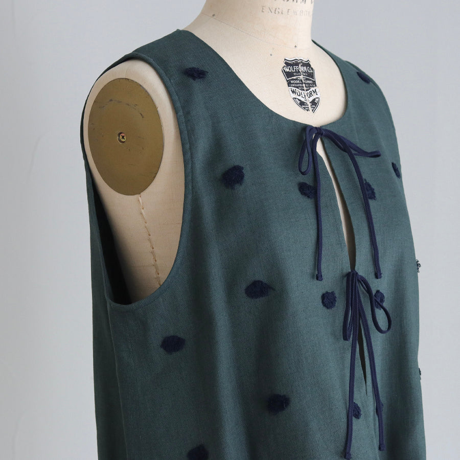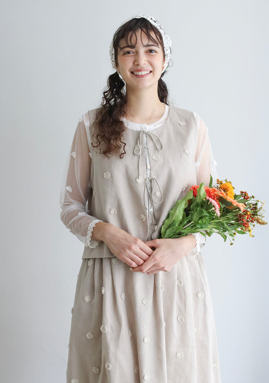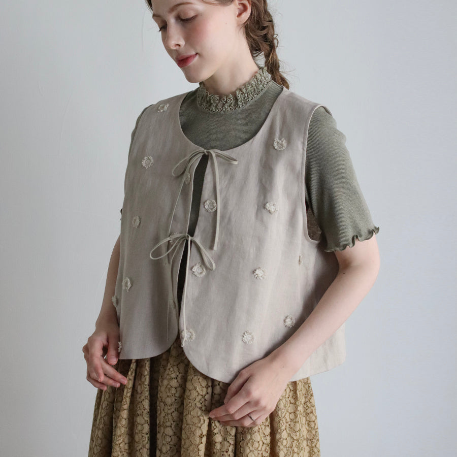 Rompi dari seri "Linen Cotton Pompom Embroidery" ini terbuat dari bahan linen katun yang sejuk dan berkualitas tinggi, dihiasi dengan bordiran pompom seperti bulu halus.