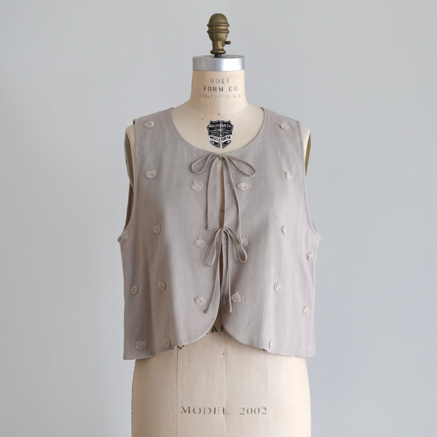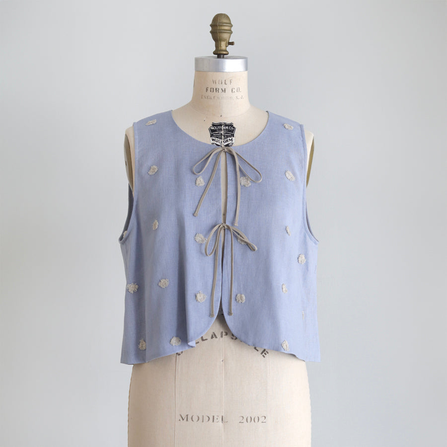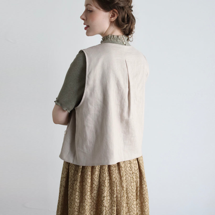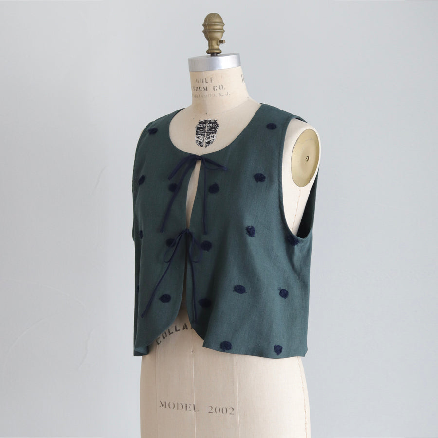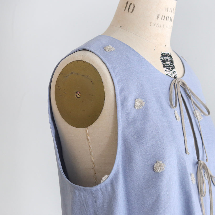 Rompi dari seri "Linen Cotton Pompom Embroidery" ini terbuat dari bahan linen katun yang sejuk dan berkualitas tinggi, dihiasi dengan bordiran pompom seperti bulu halus.