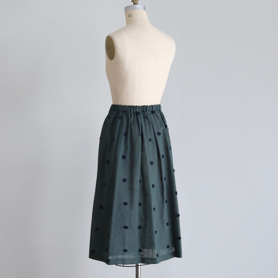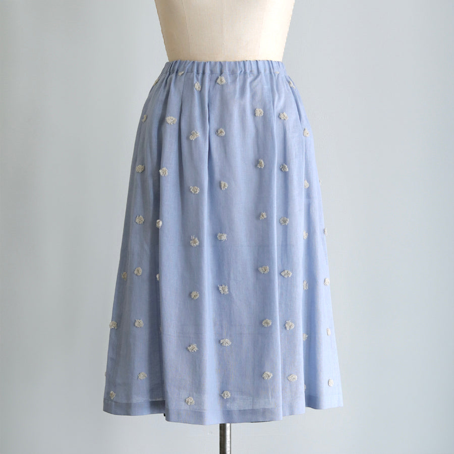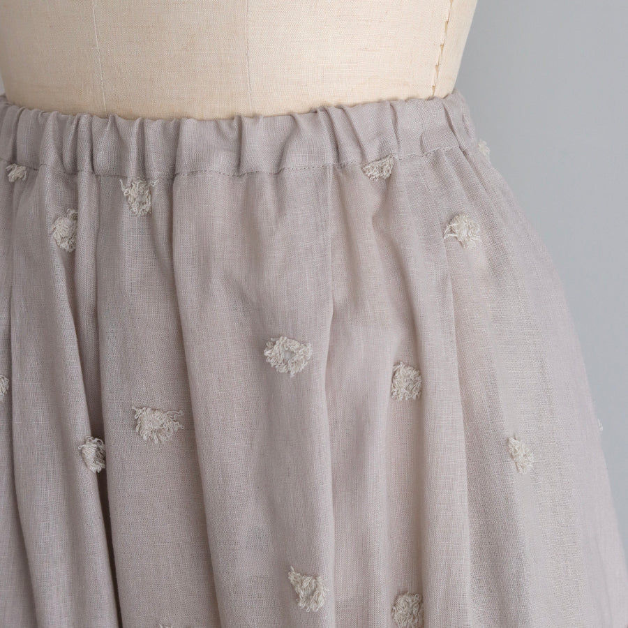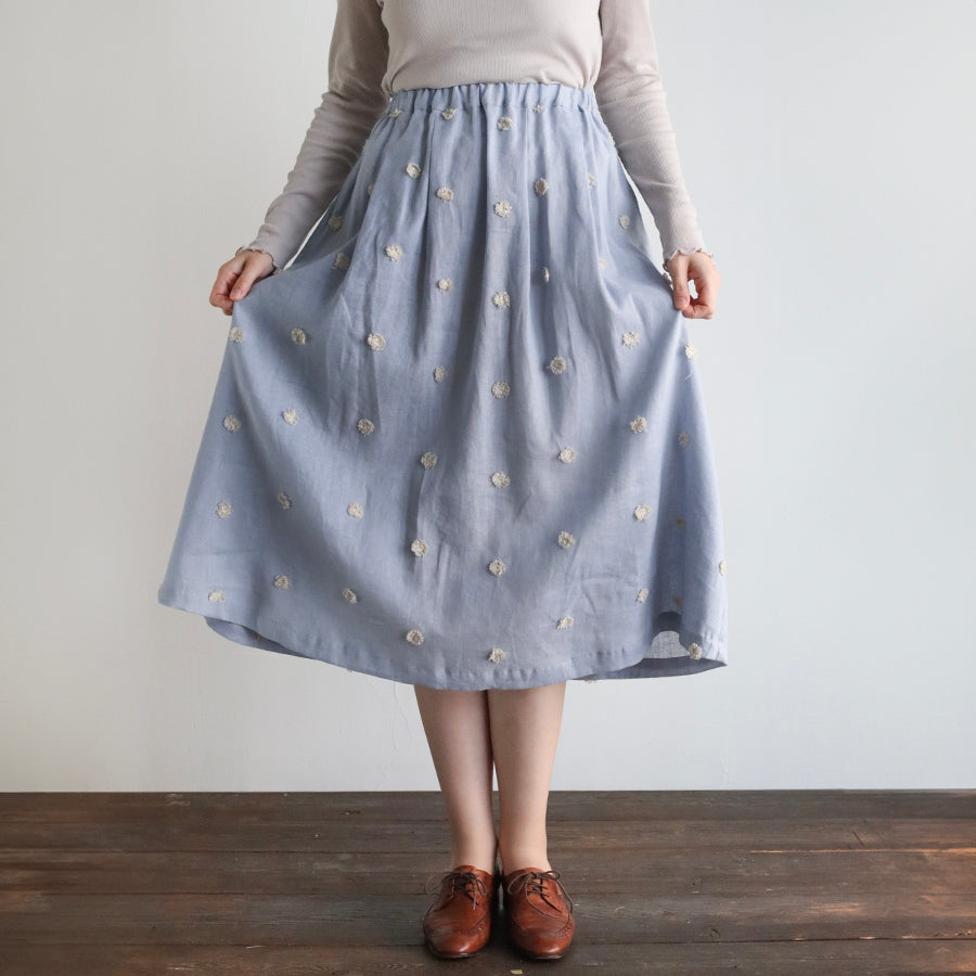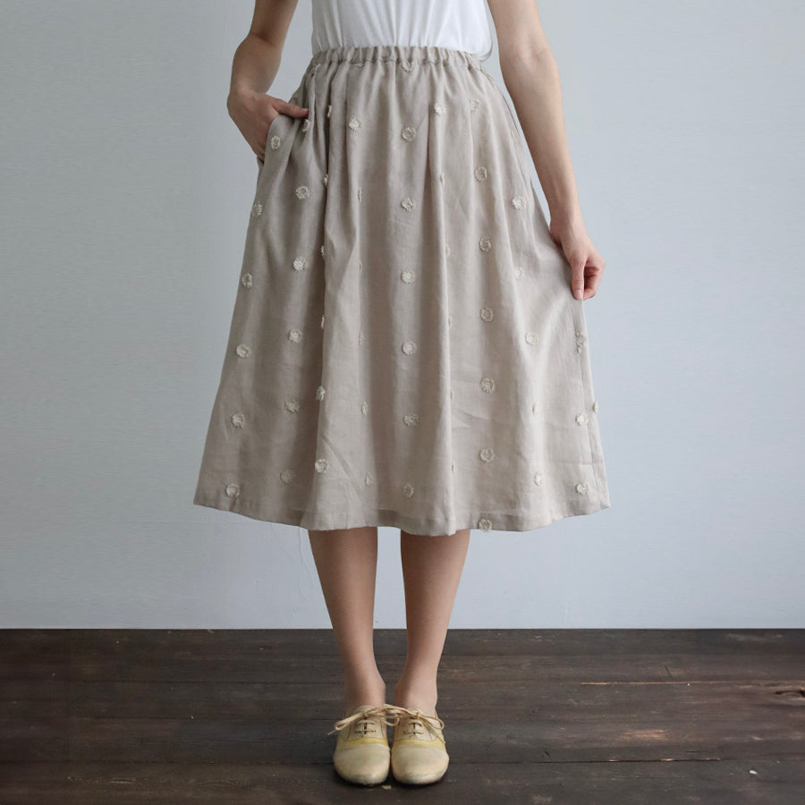 Rok dari seri "Linen Cotton pompom Embroidery" yang dihiasi bordir pompom seperti bulu di bahan linen katun berkualitas tinggi yang sejuk.