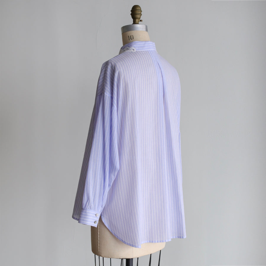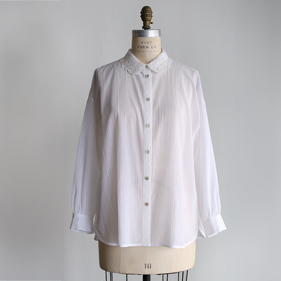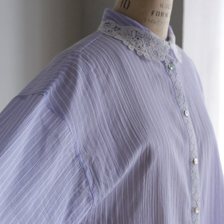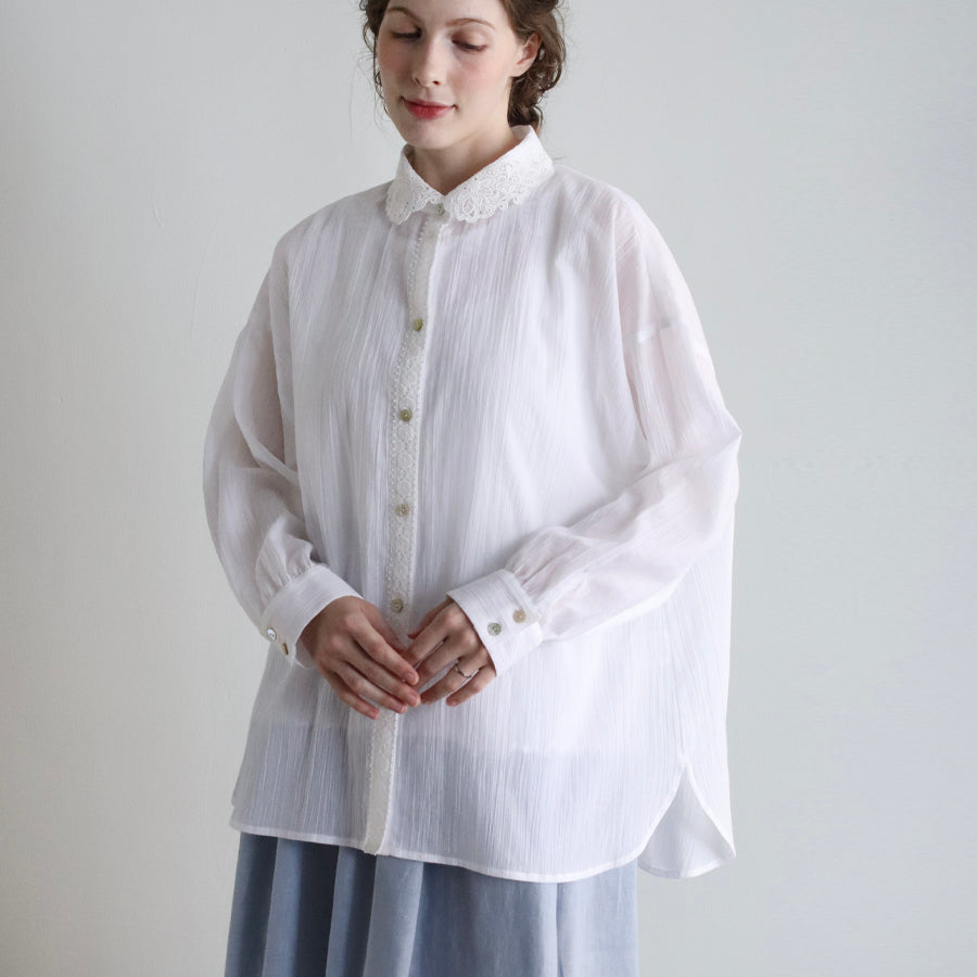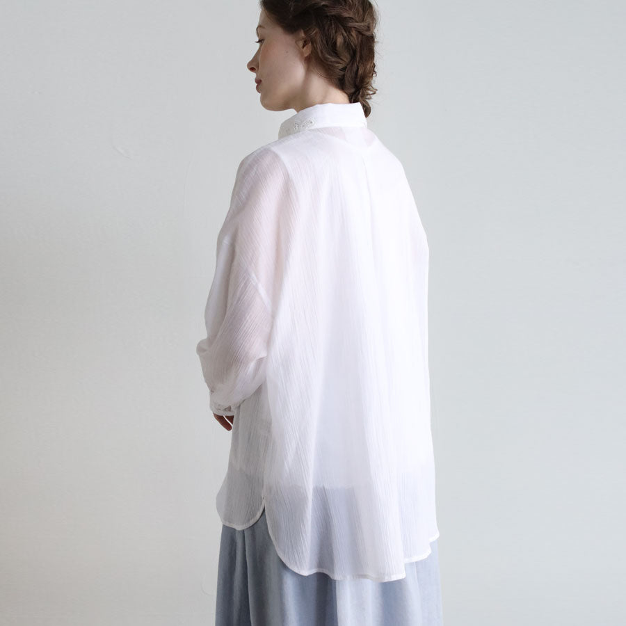 清涼感のある楊柳生地で仕立てたアキハコットンのシャツ。空羽(アキハ)織りと言われる縦糸を等間隔で抜いて織り上げる技法により、ふんわりと軽やかな風合いと独特のシボ感を作り出しています。