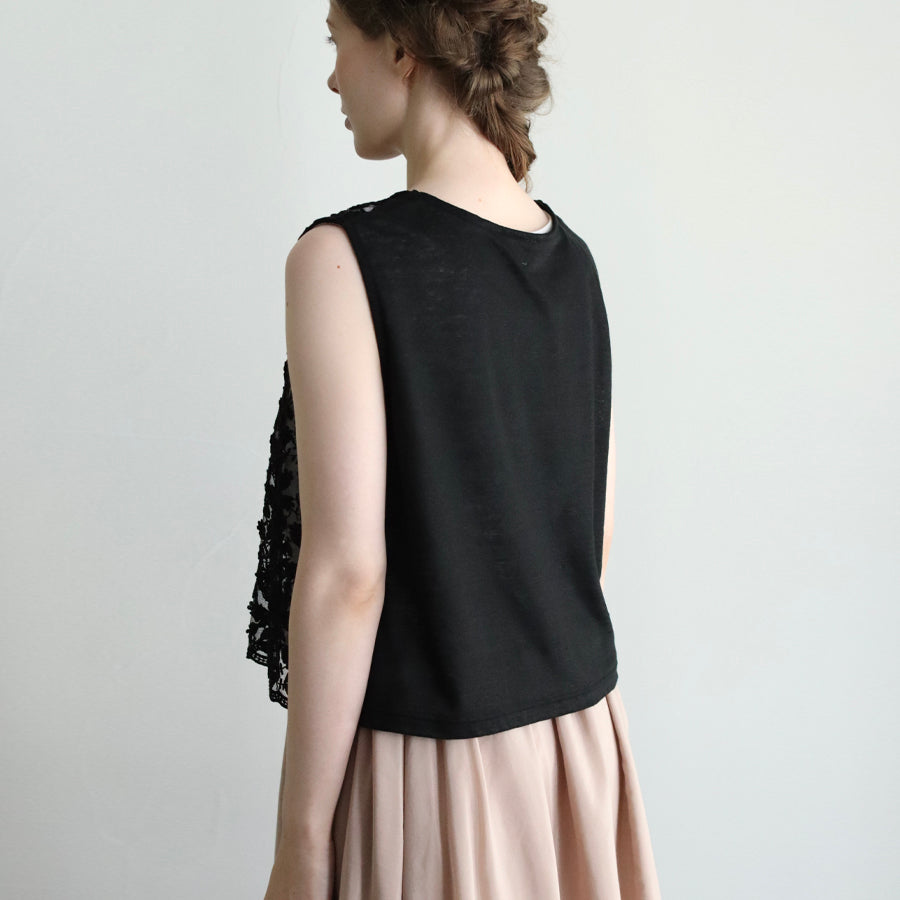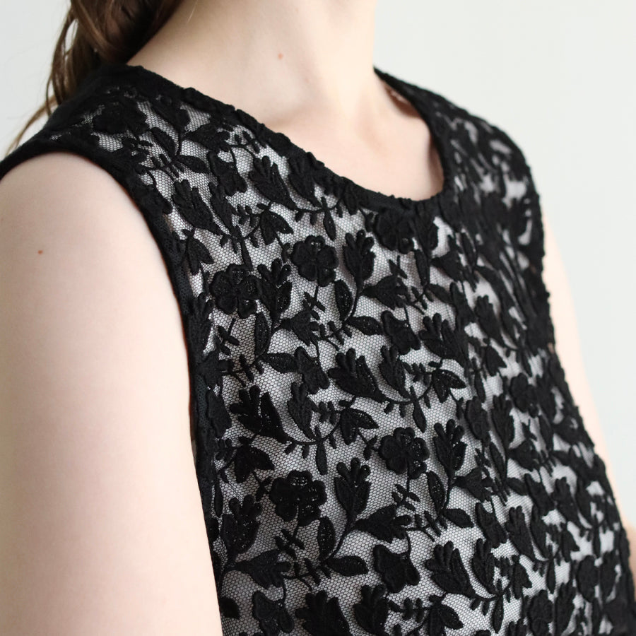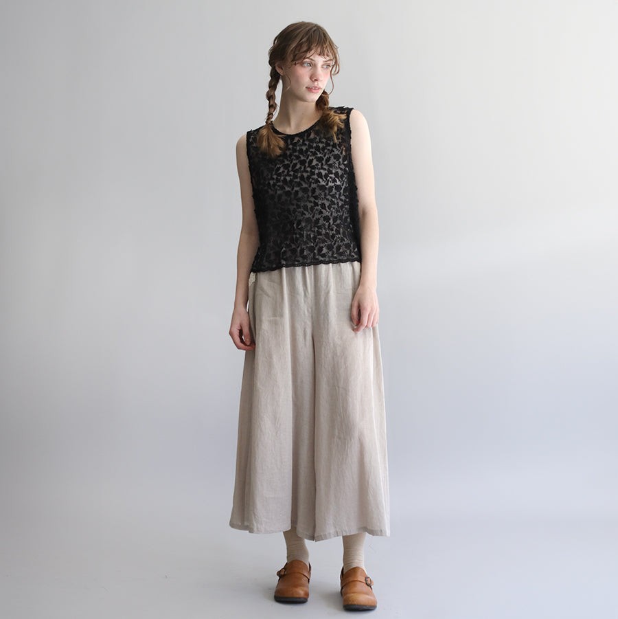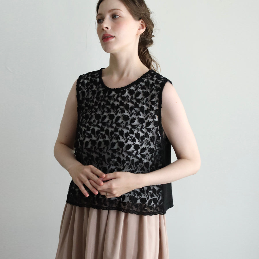 やわらかなオンケミレースとリネンのタンクトップ。オンケミという手法で、刺繍を2回かけることで立体感のあるレースに仕立てています。