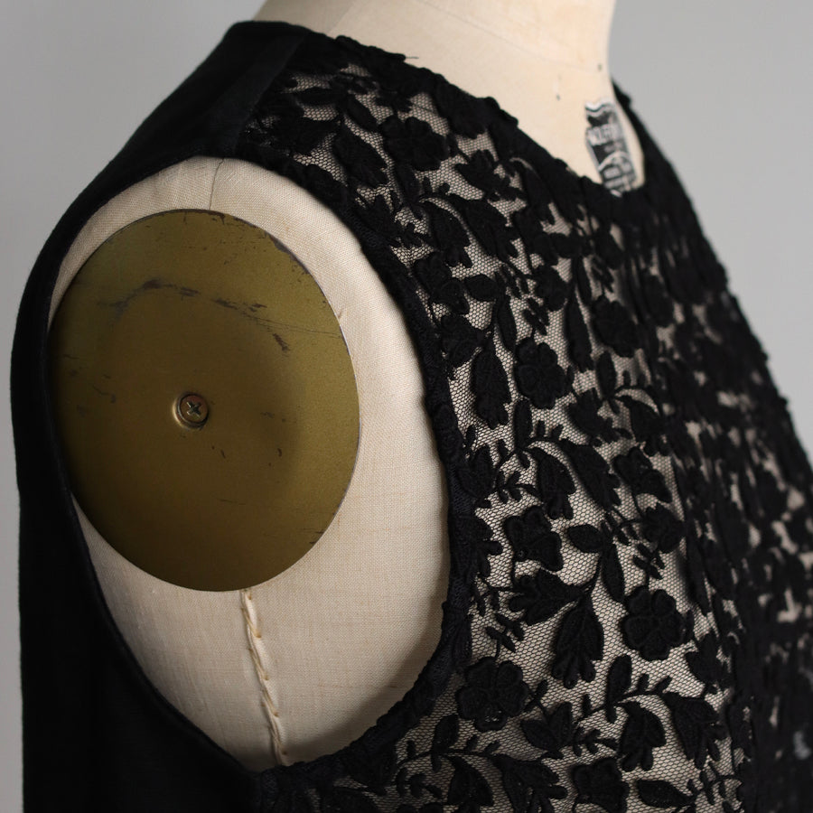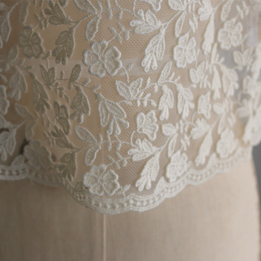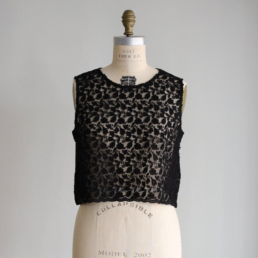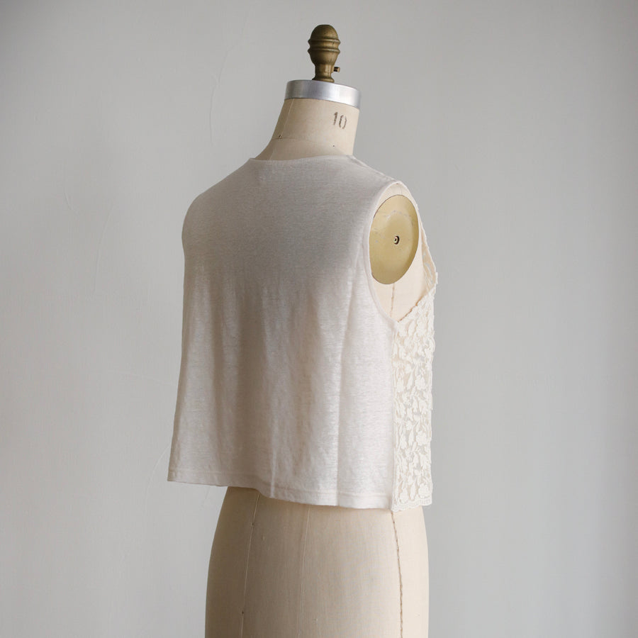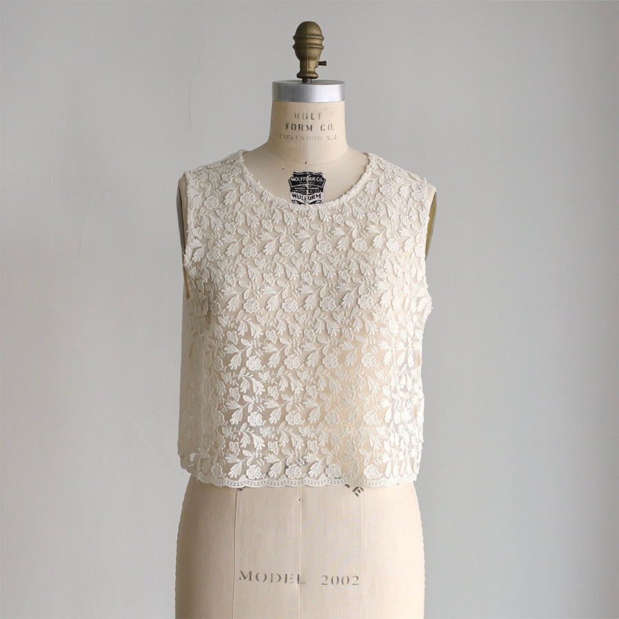やわらかなオンケミレースとリネンのタンクトップ。オンケミという手法で、刺繍を2回かけることで立体感のあるレースに仕立てています。