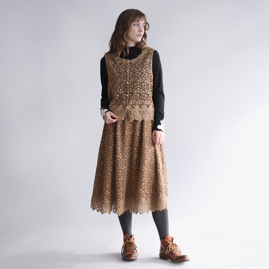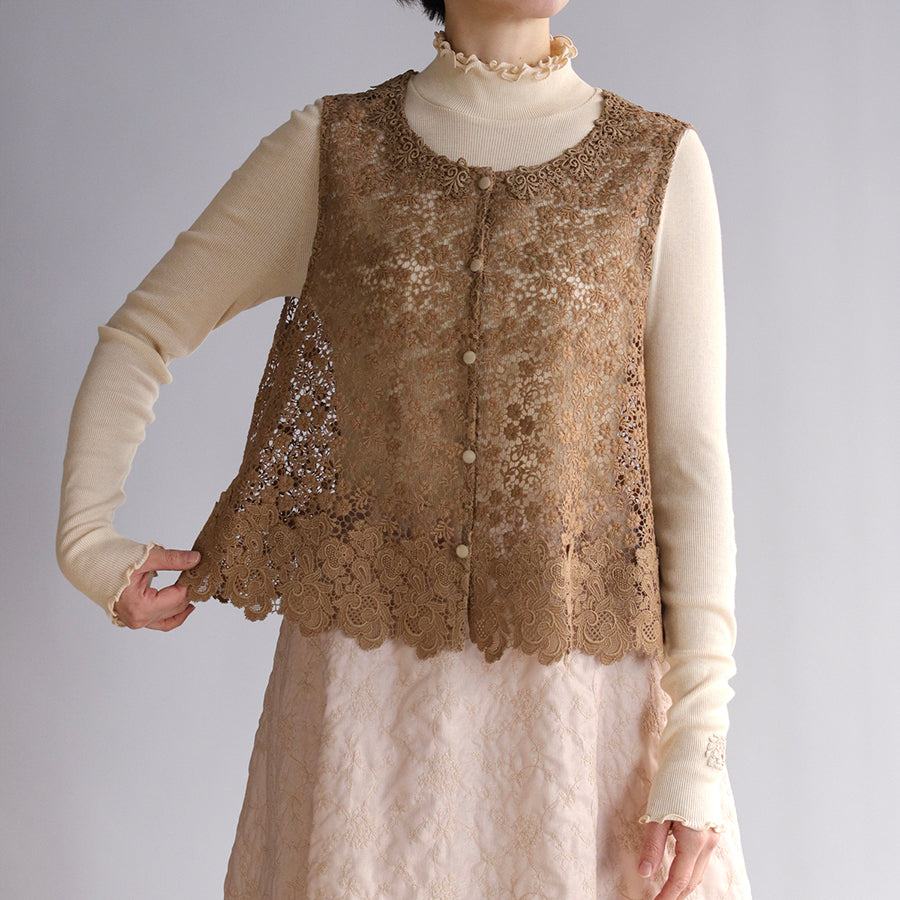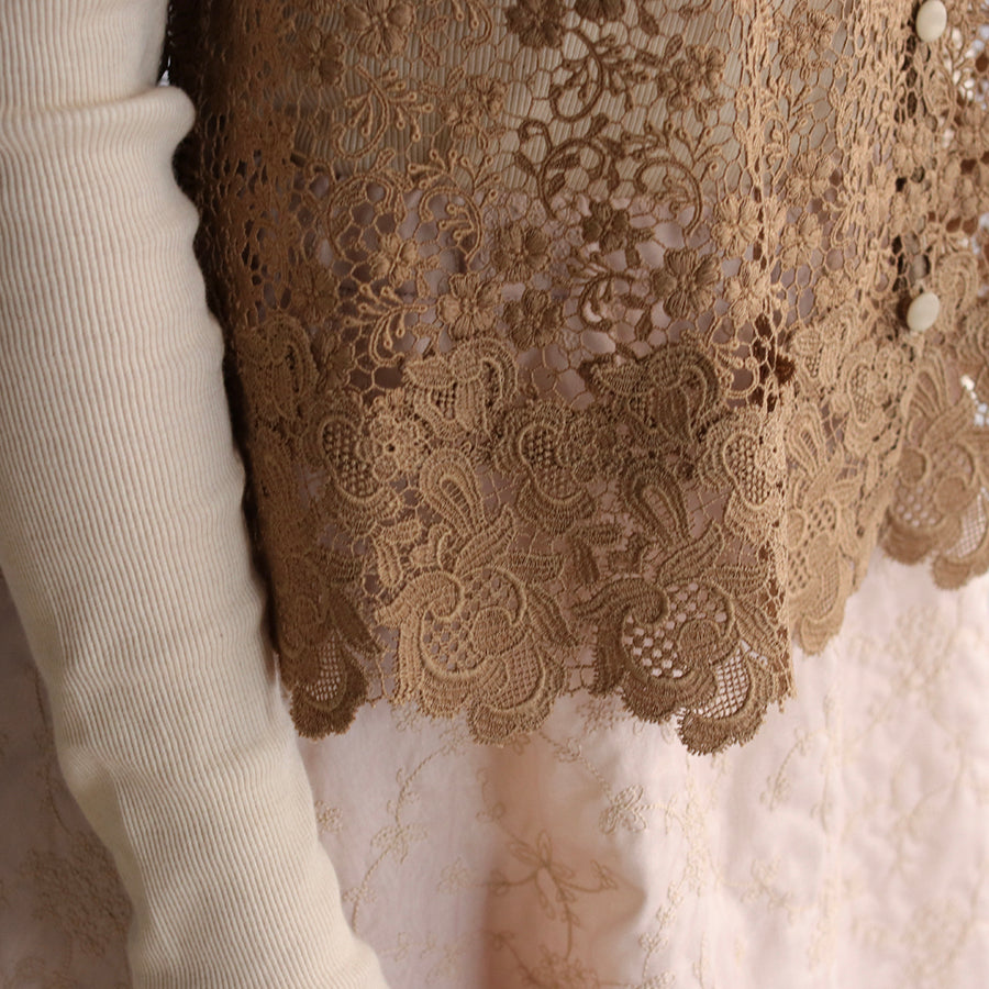 小さなお花がつらなったような華奢で可愛らしいデザインの花つむぎケミカルレースと、クラシカルな花音ケミカルを組み合わせたケミカルコンビベスト。