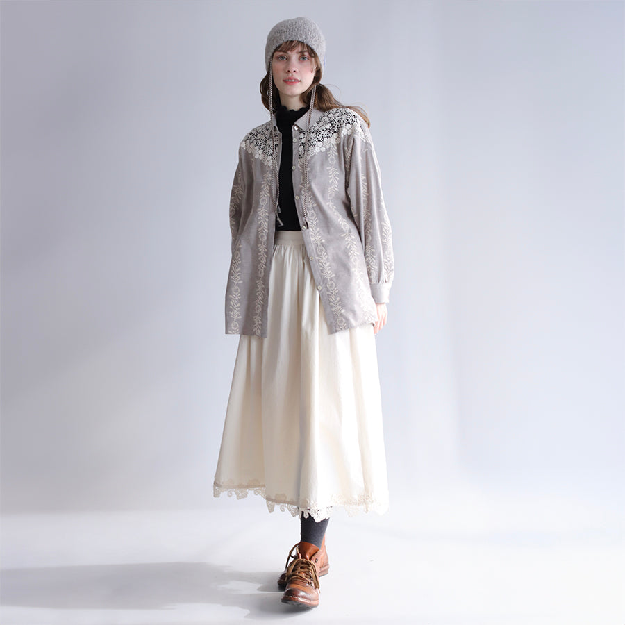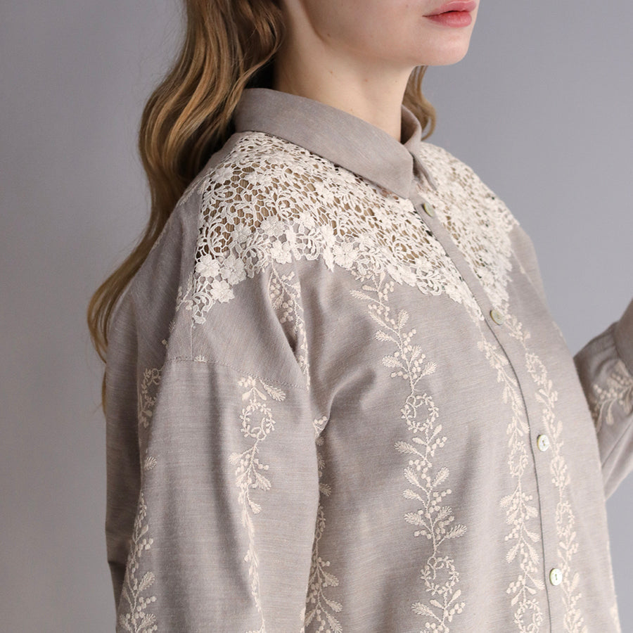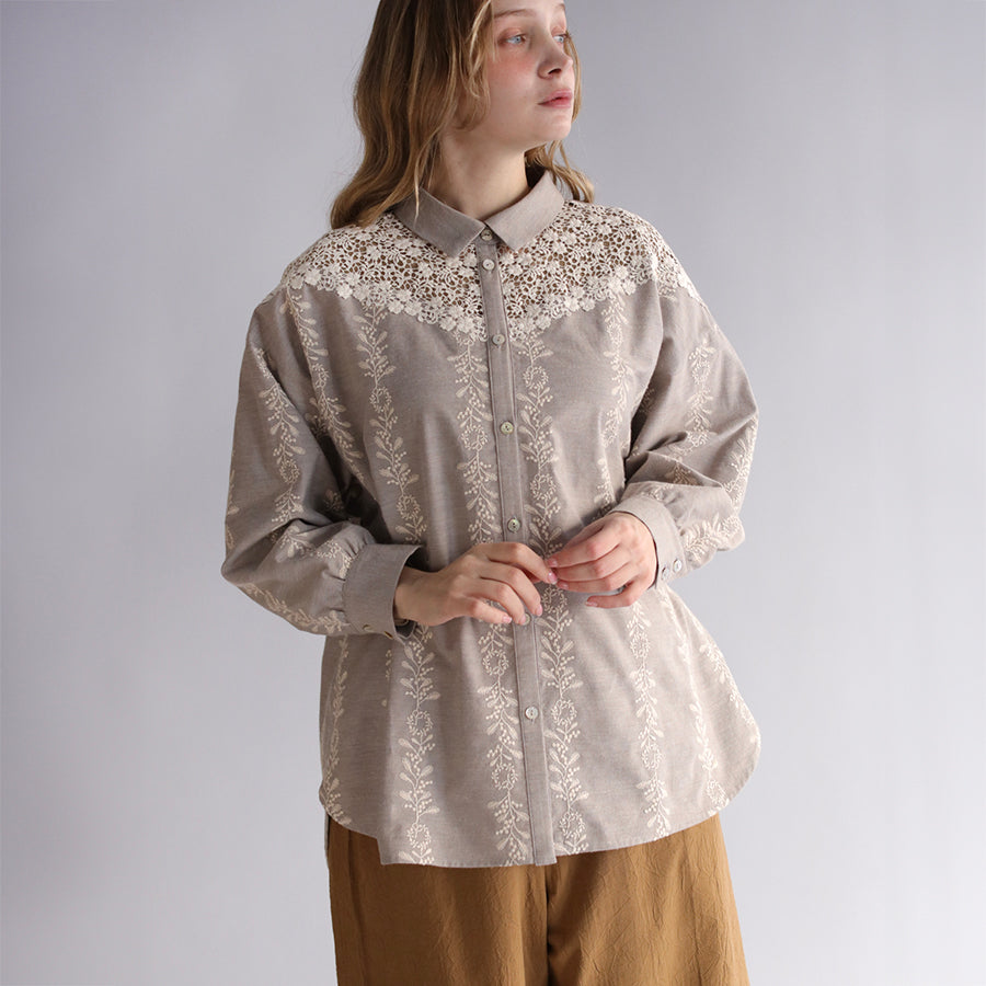 ほんのり起毛したやわらかなコットンツイルにオリジナル刺繍をのせた"かりん刺繍"シリーズのシャツブラウス。