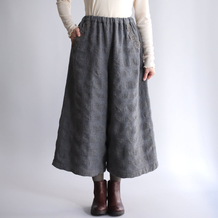 華やかなREIのレーストップスにはシンプルで上質なウールパンツは欠かせないマストアイテム。