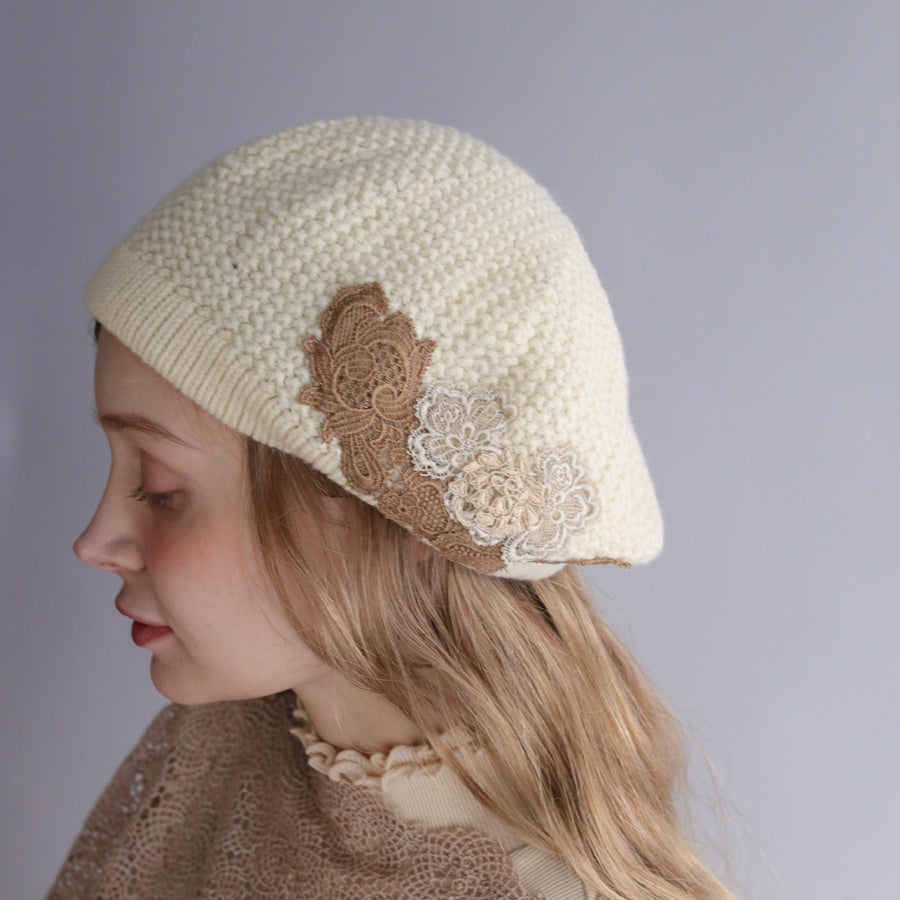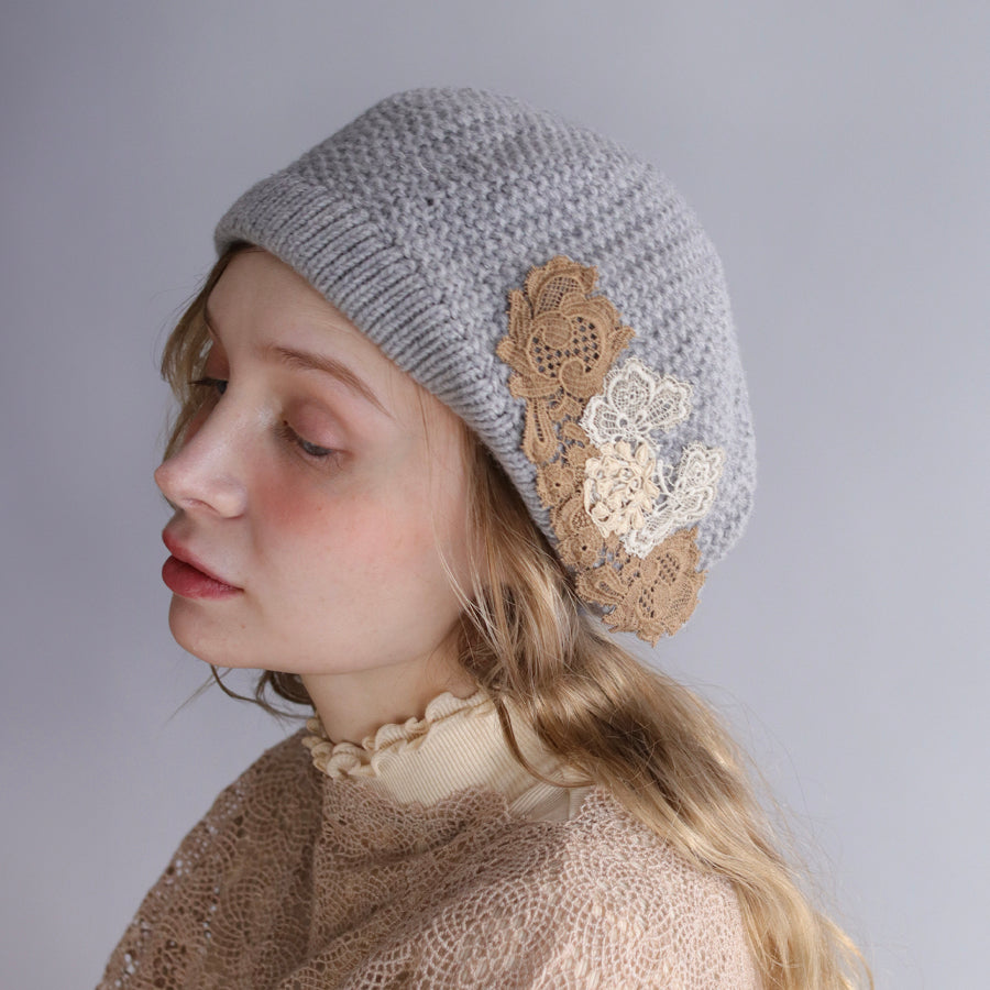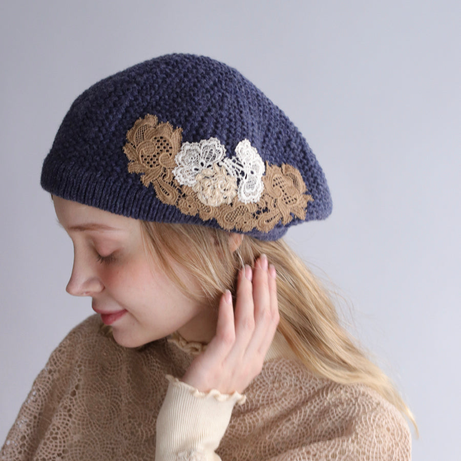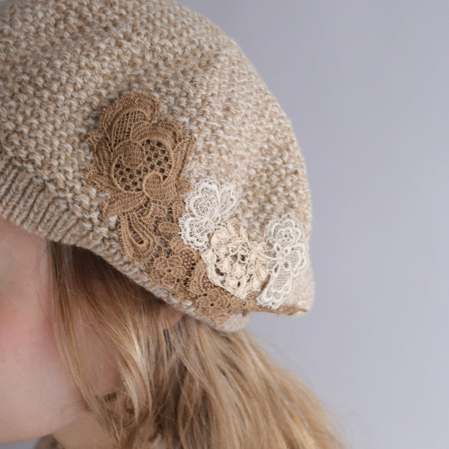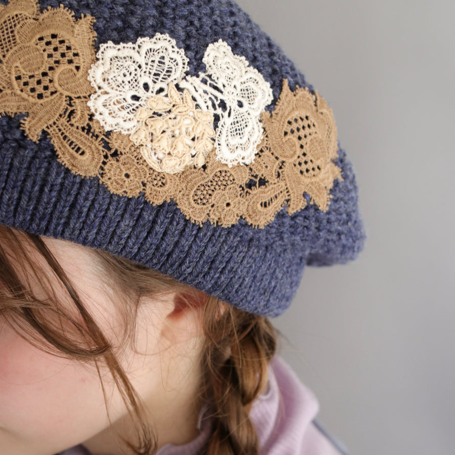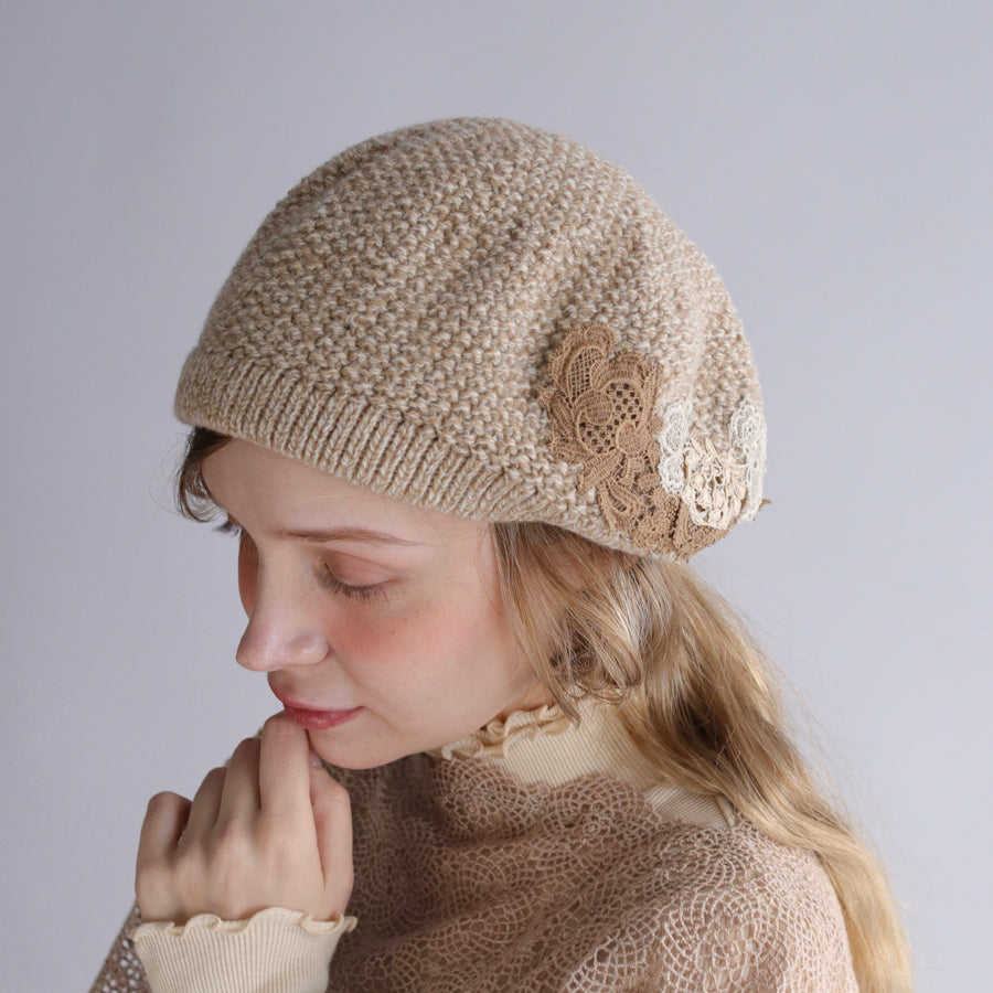 タスマニアウールを二本取りしてぽこぽこのかのこ編みにしたベレー帽。