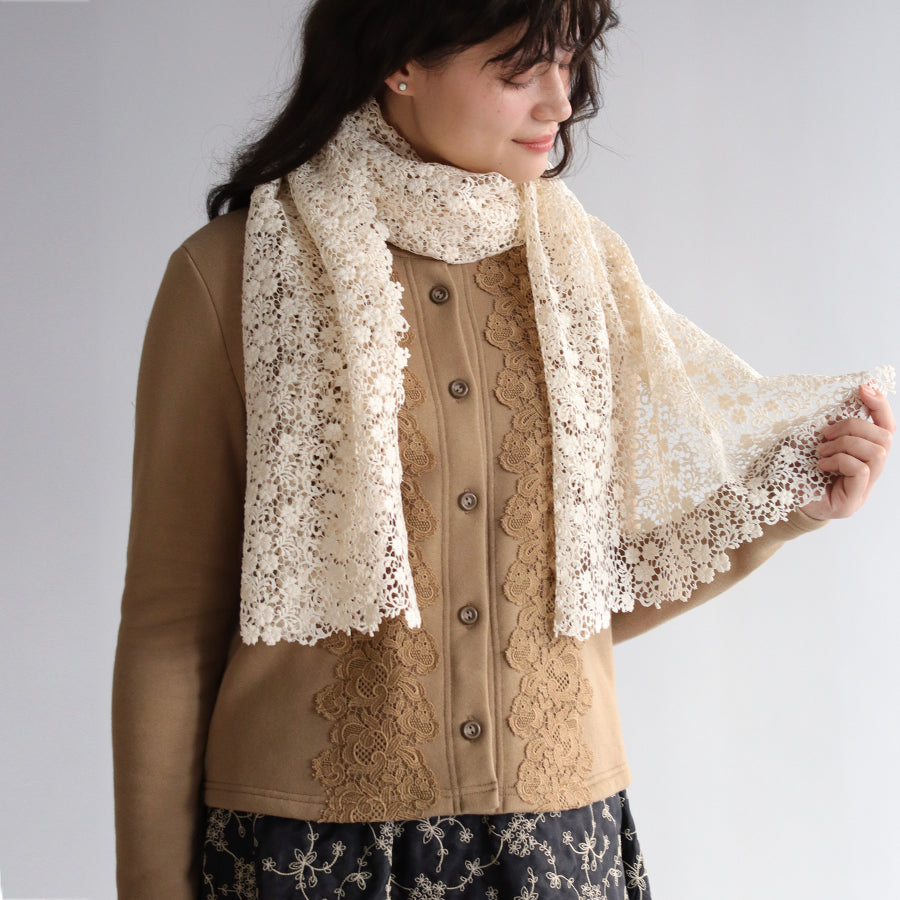 洋装にも和装にも合わせやすく、ハンドカットしたレースの縁取りも美しい一枚です。