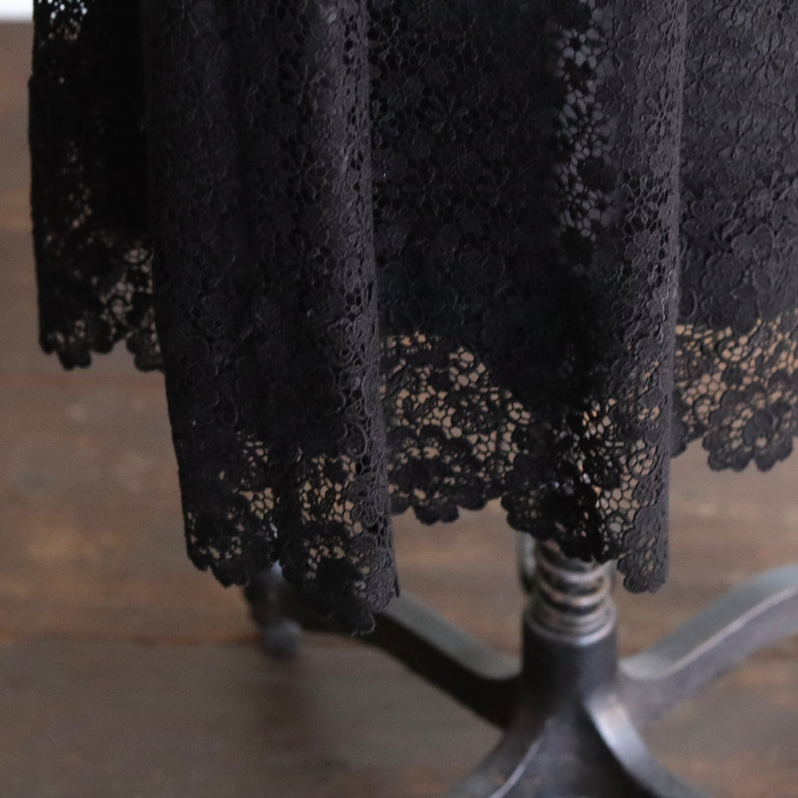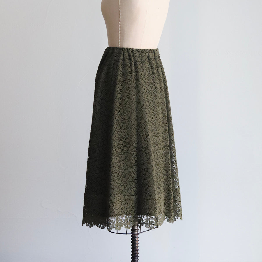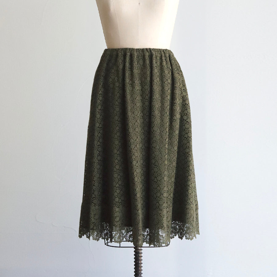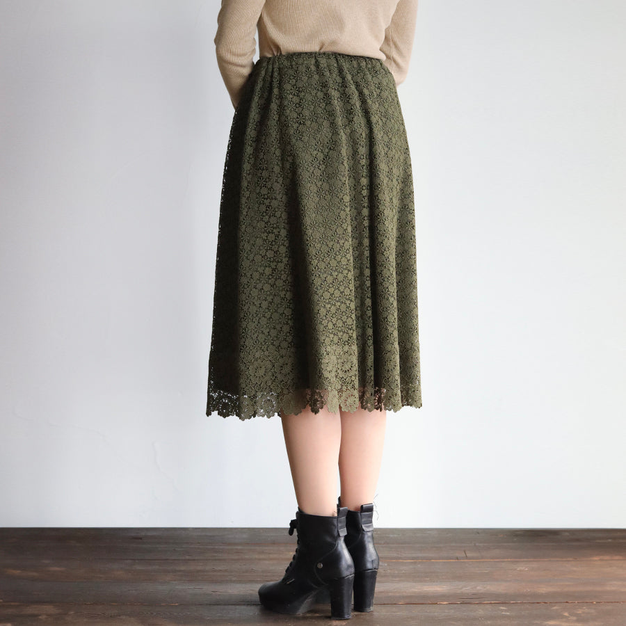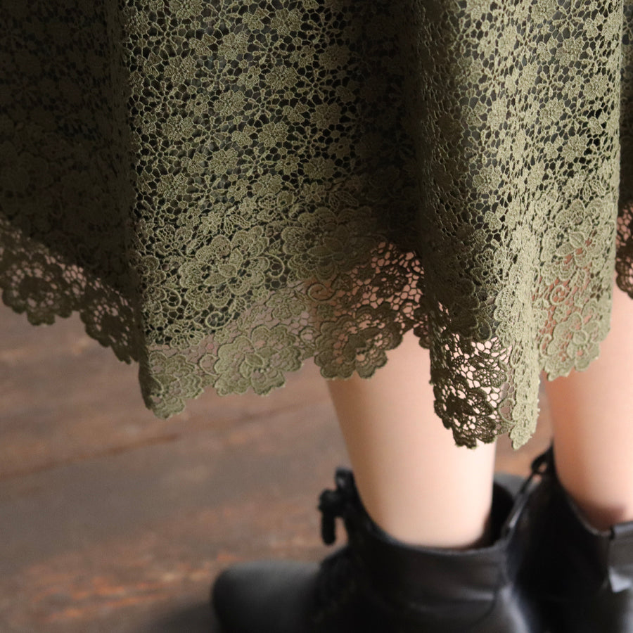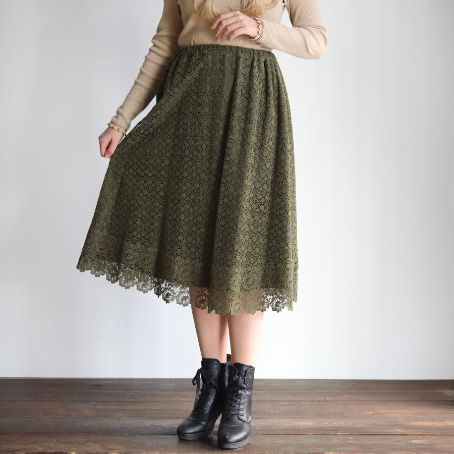 可憐な小花が集まった【jolieケミカルレース】の裾に魅力的な柄行が美しい【charmyケミカルレース】の2種類のレースを縫い合わせたスカート。