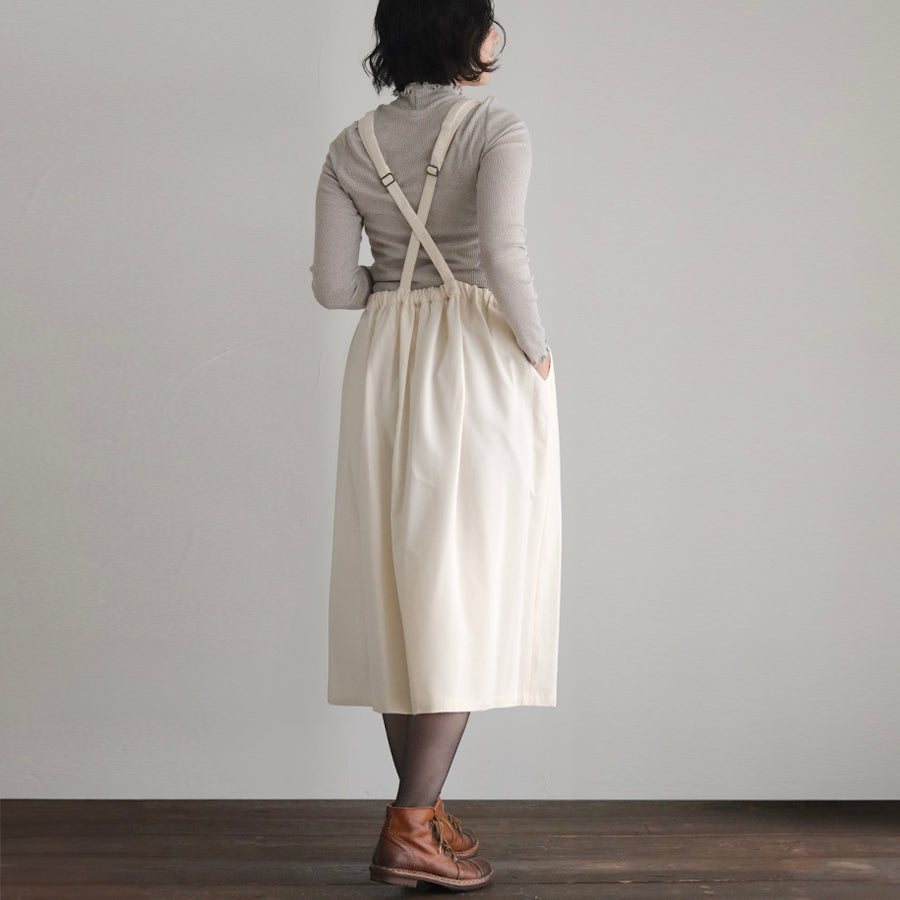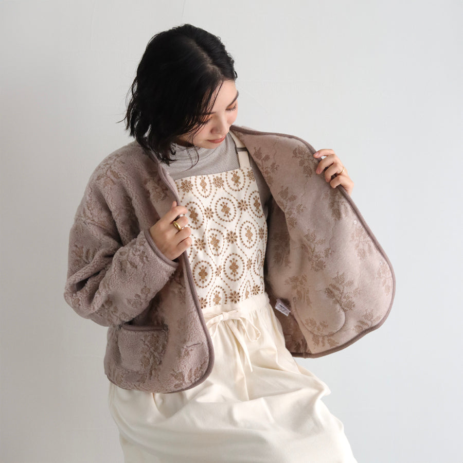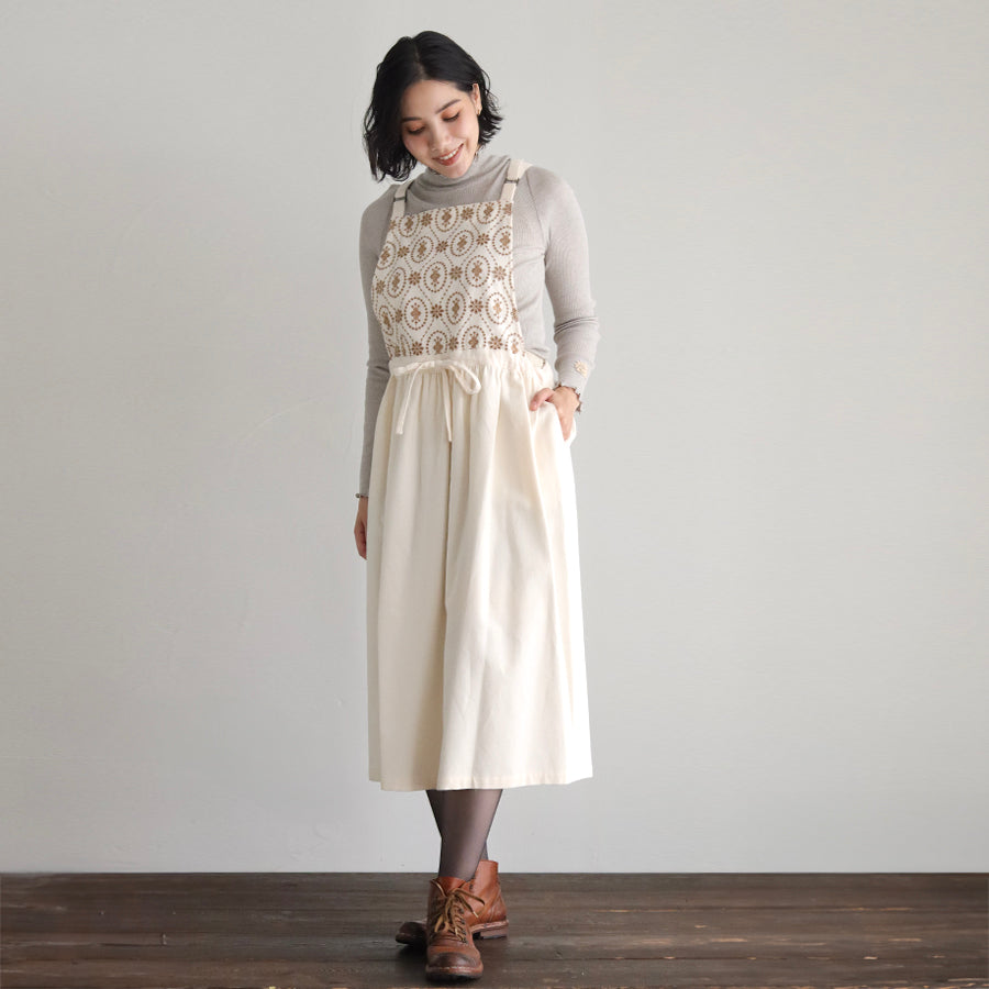 綿織物の産地として知られる兵庫県北播地方で作られたオーガニックコットンに、クラシカルなオーバルデザインのボーラー刺繍を施した「オーガニックコットンemblem刺繍」のエプロンワンピース。