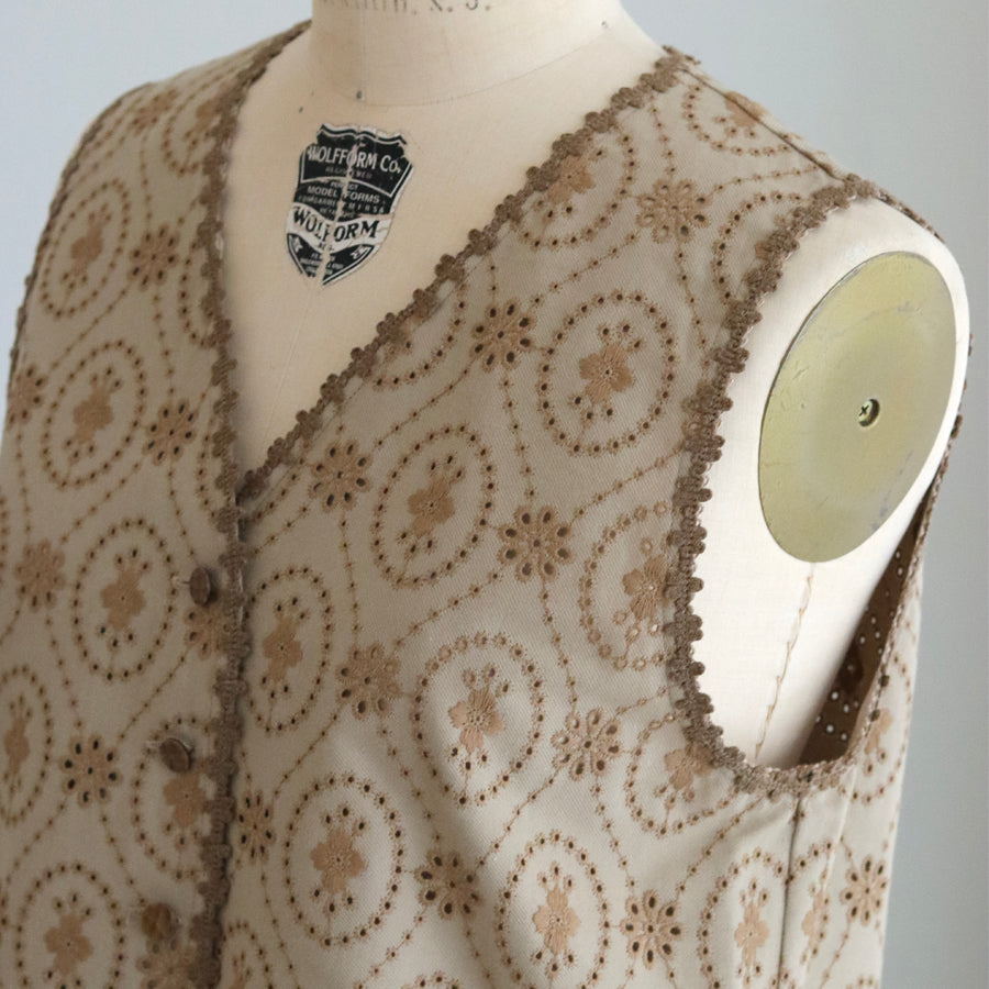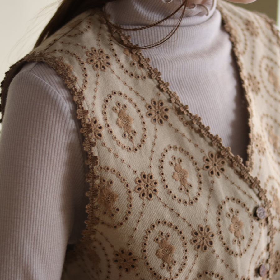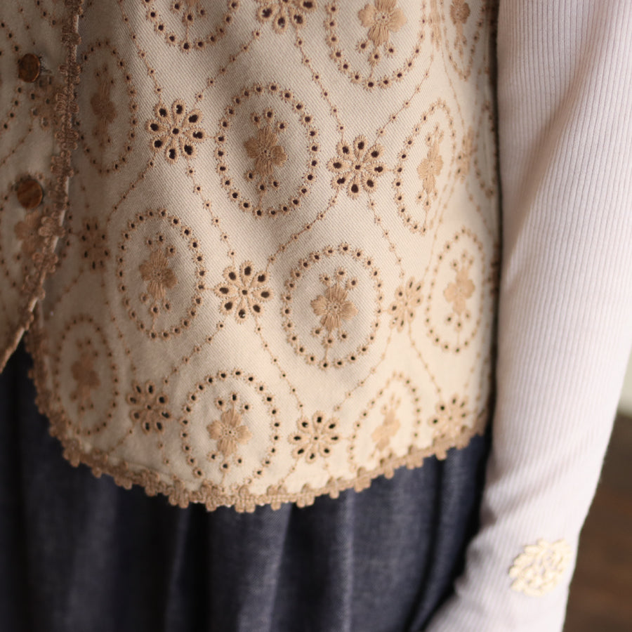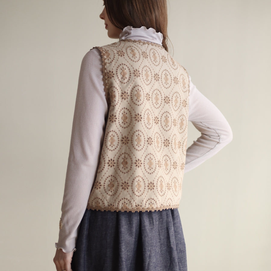 綿織物の産地として知られる兵庫県北播地方で作られたオーガニックコットンに、クラシカルなオーバルデザインのボーラー刺繍を施した「オーガニックコットンemblem刺繍」のベスト。