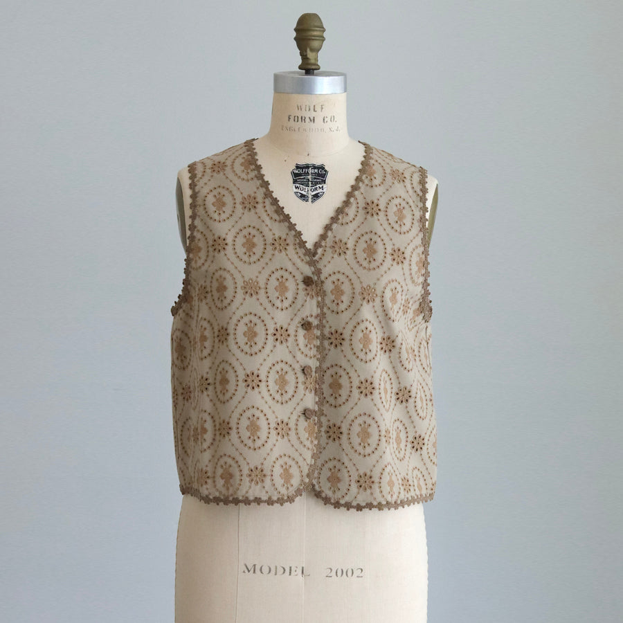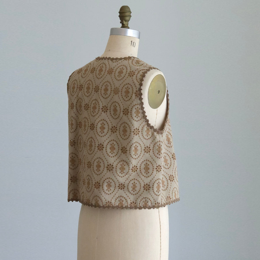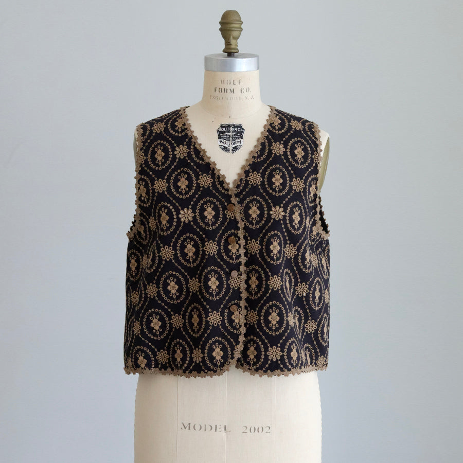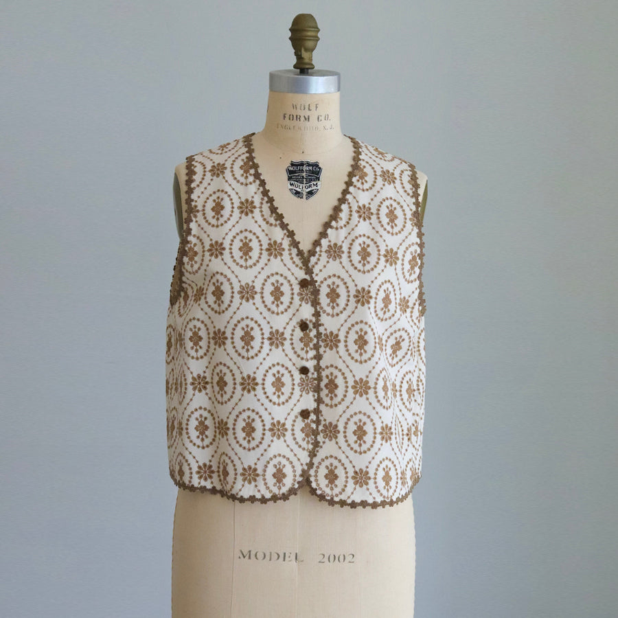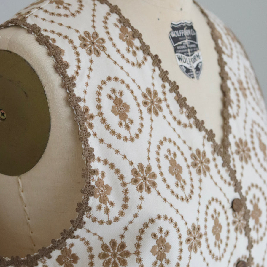 綿織物の産地として知られる兵庫県北播地方で作られたオーガニックコットンに、クラシカルなオーバルデザインのボーラー刺繍を施した「オーガニックコットンemblem刺繍」のベスト。