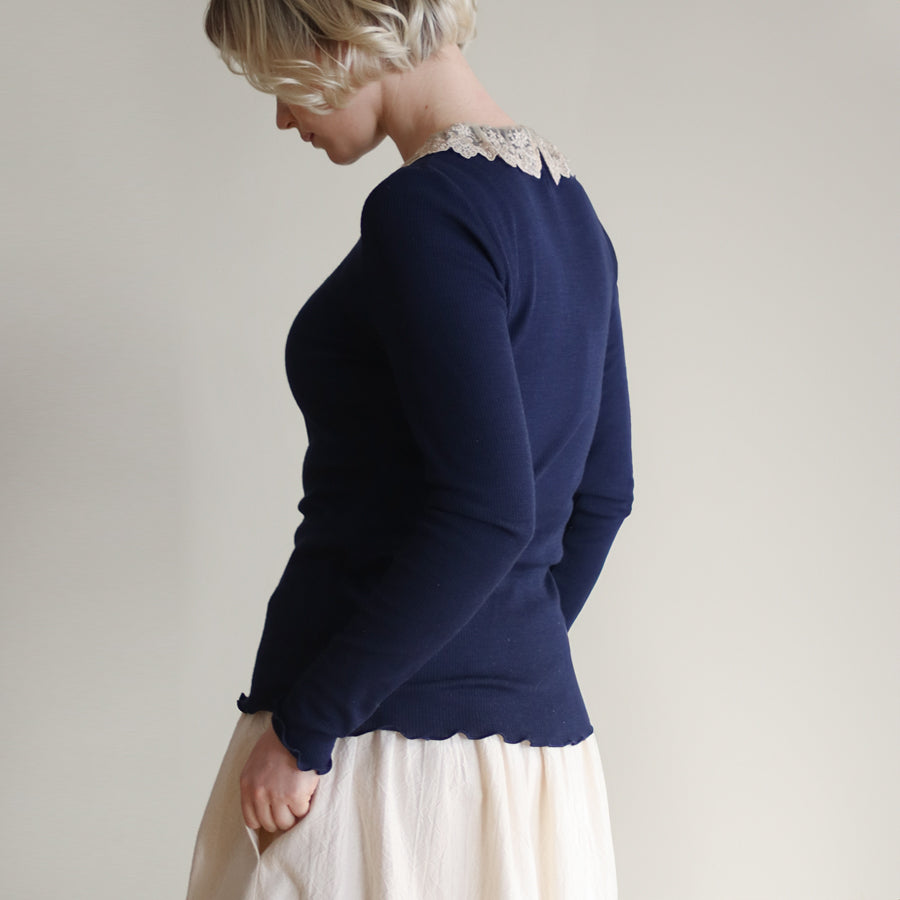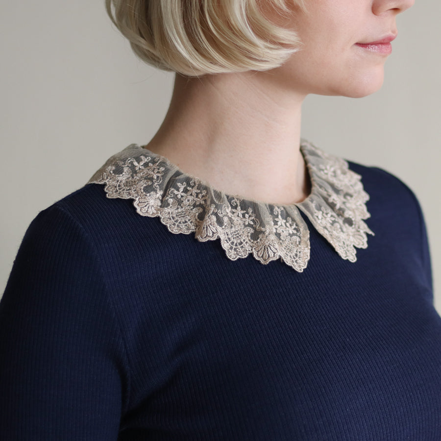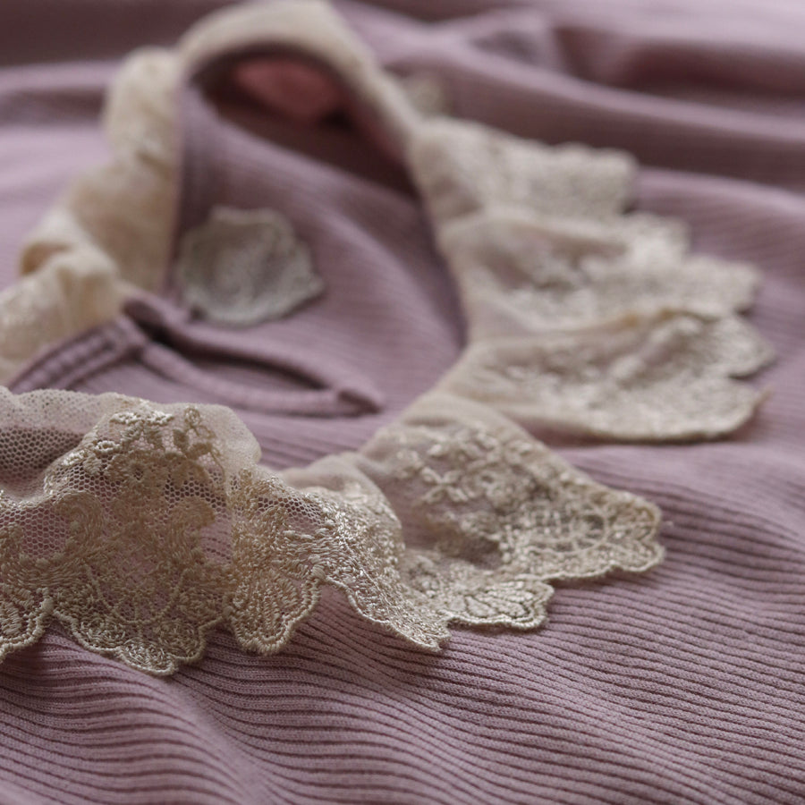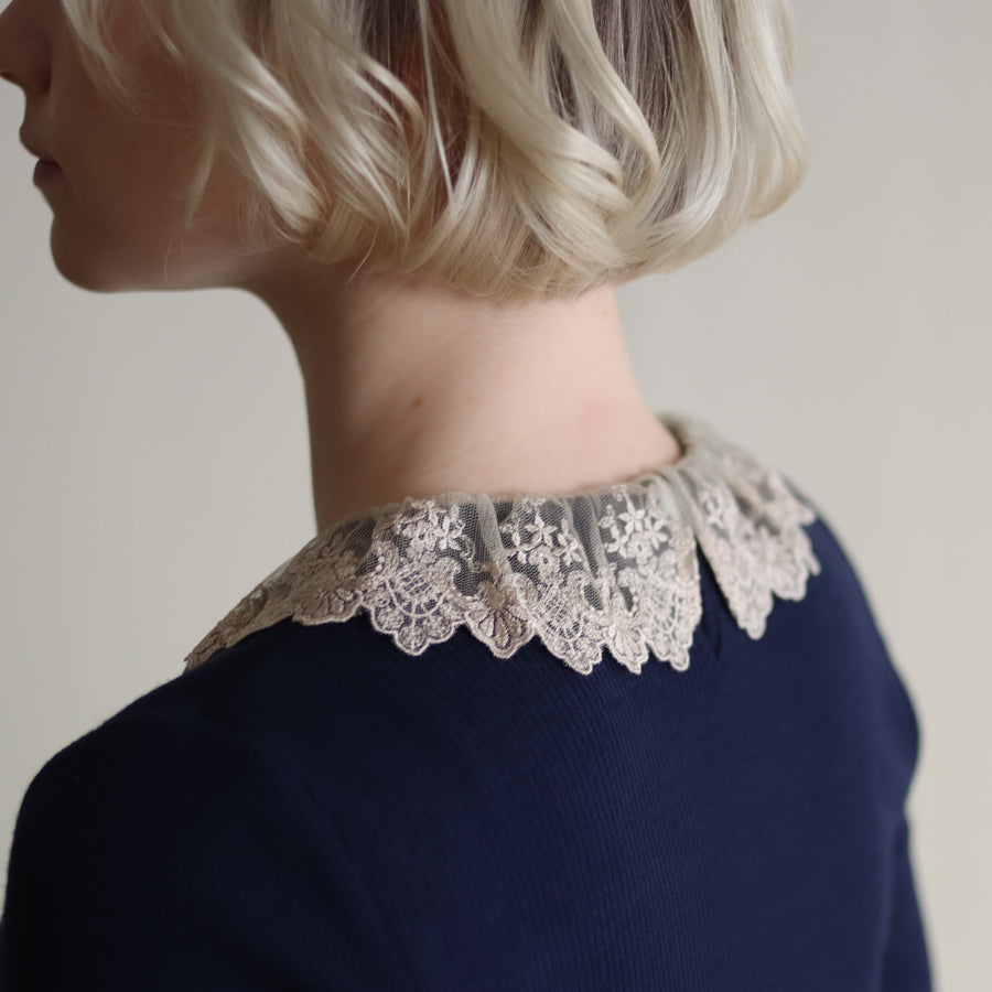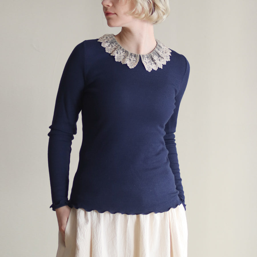 クルーネックをチュールレースであしらった、華やかなインナーです。