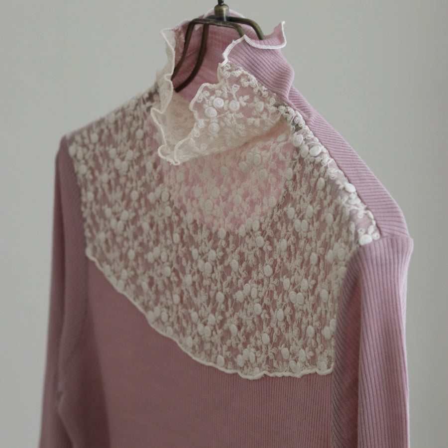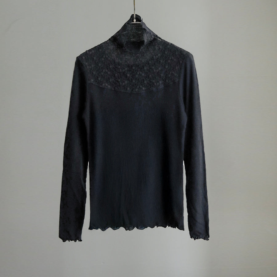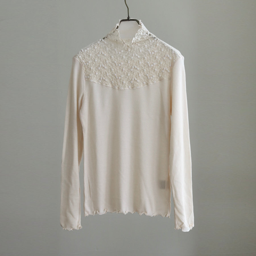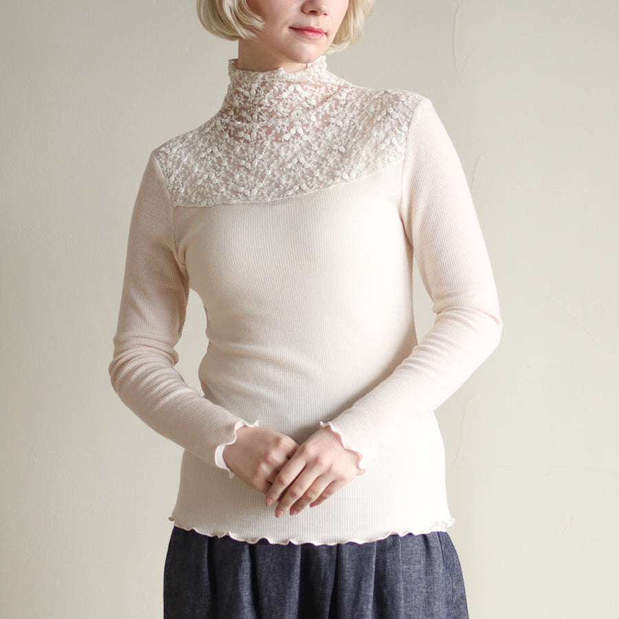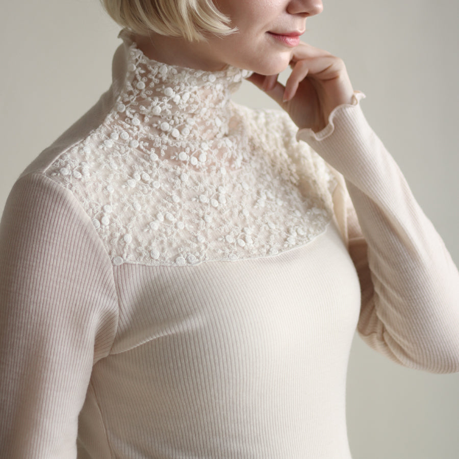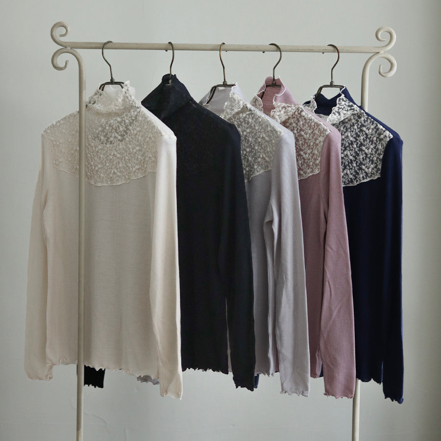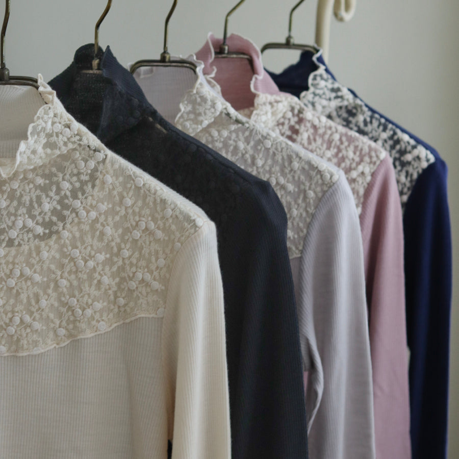 首元はチュールレースになっているため、締め付けがなくハイネックが苦手な方にもおすすめ。