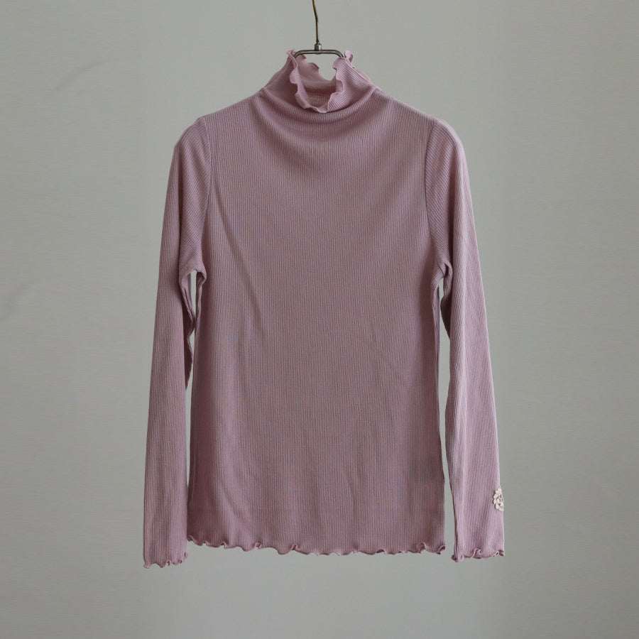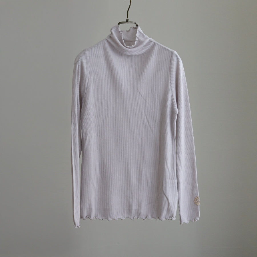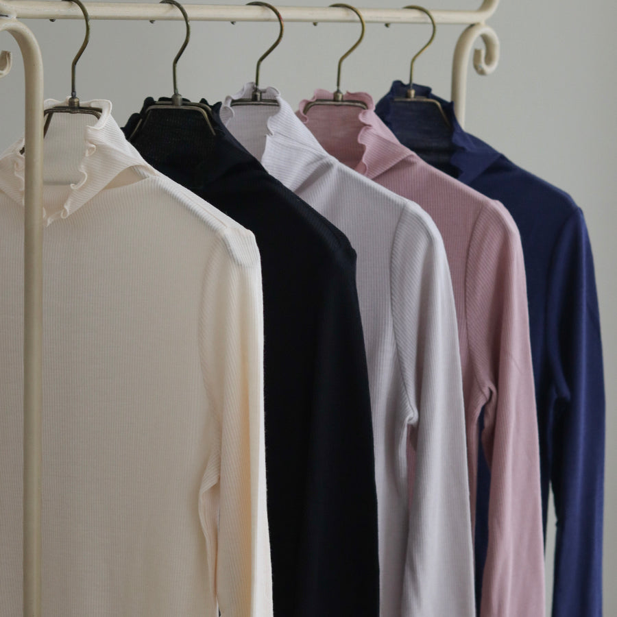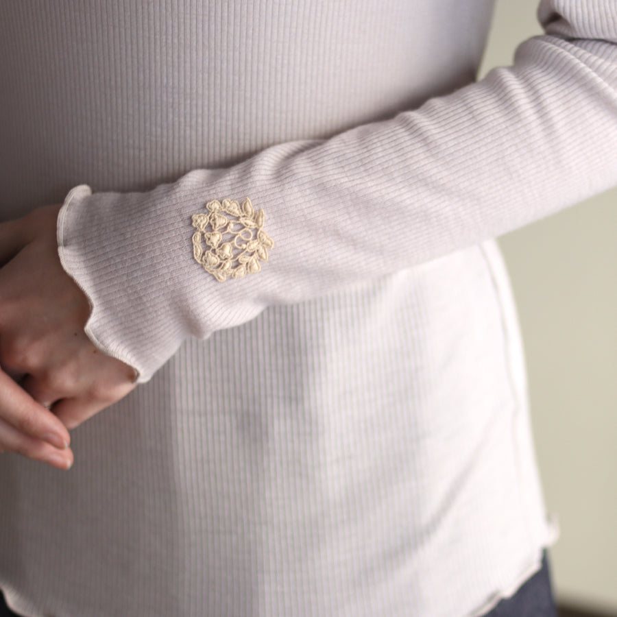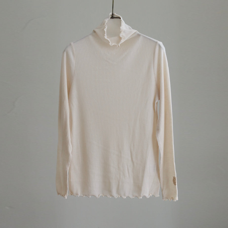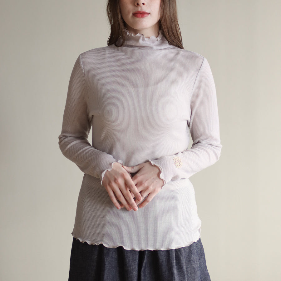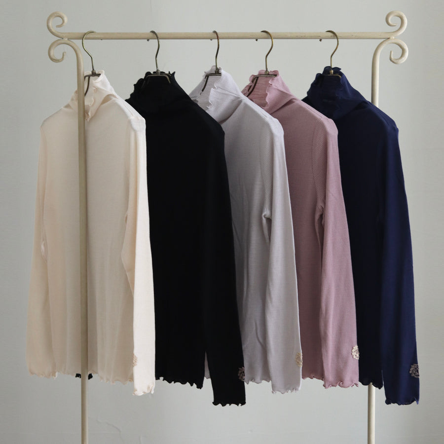 お袖にREIのロゴエンブレムレースを縫い付けアクセントにしたシンプルなハイネックインナーです。
