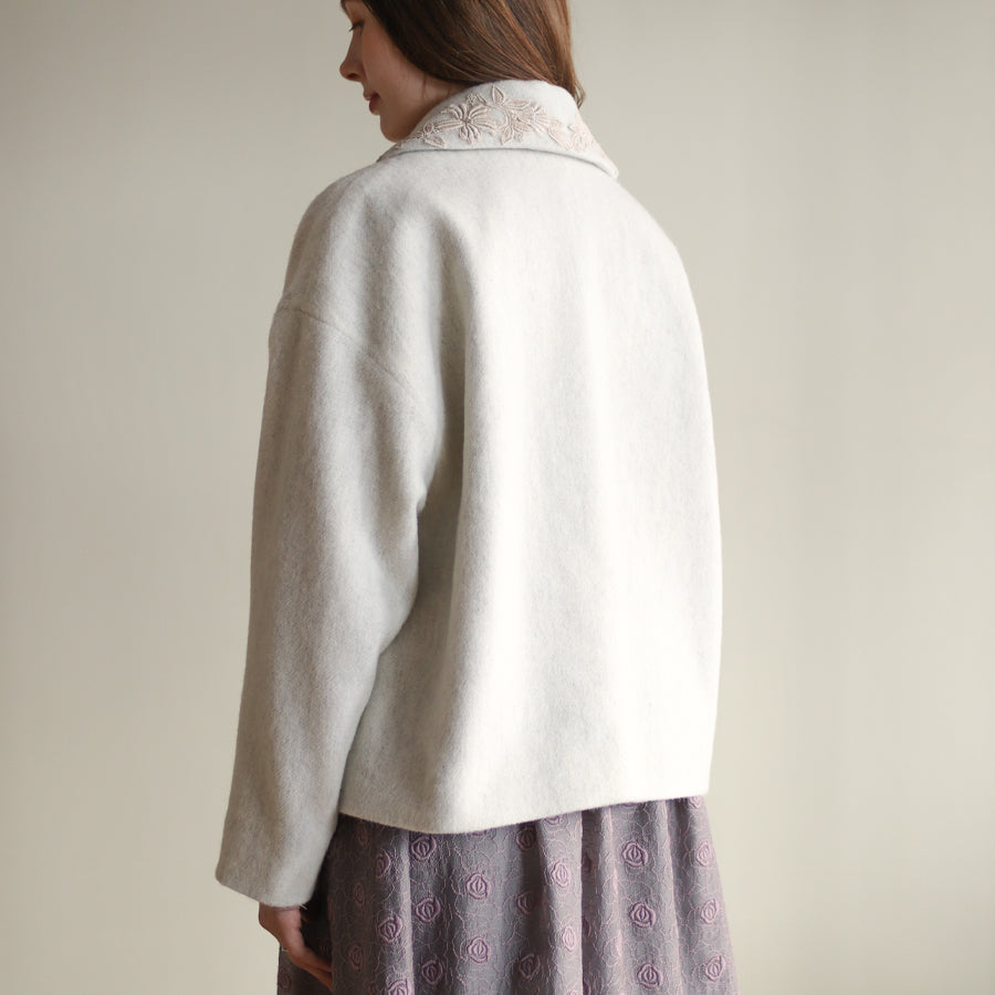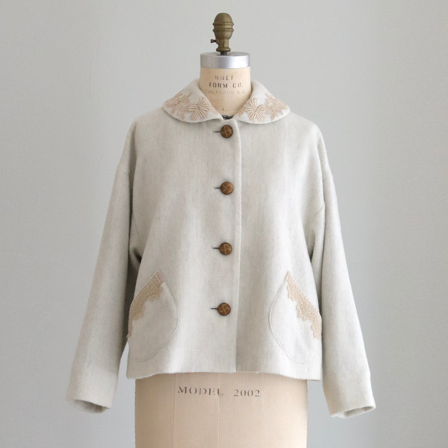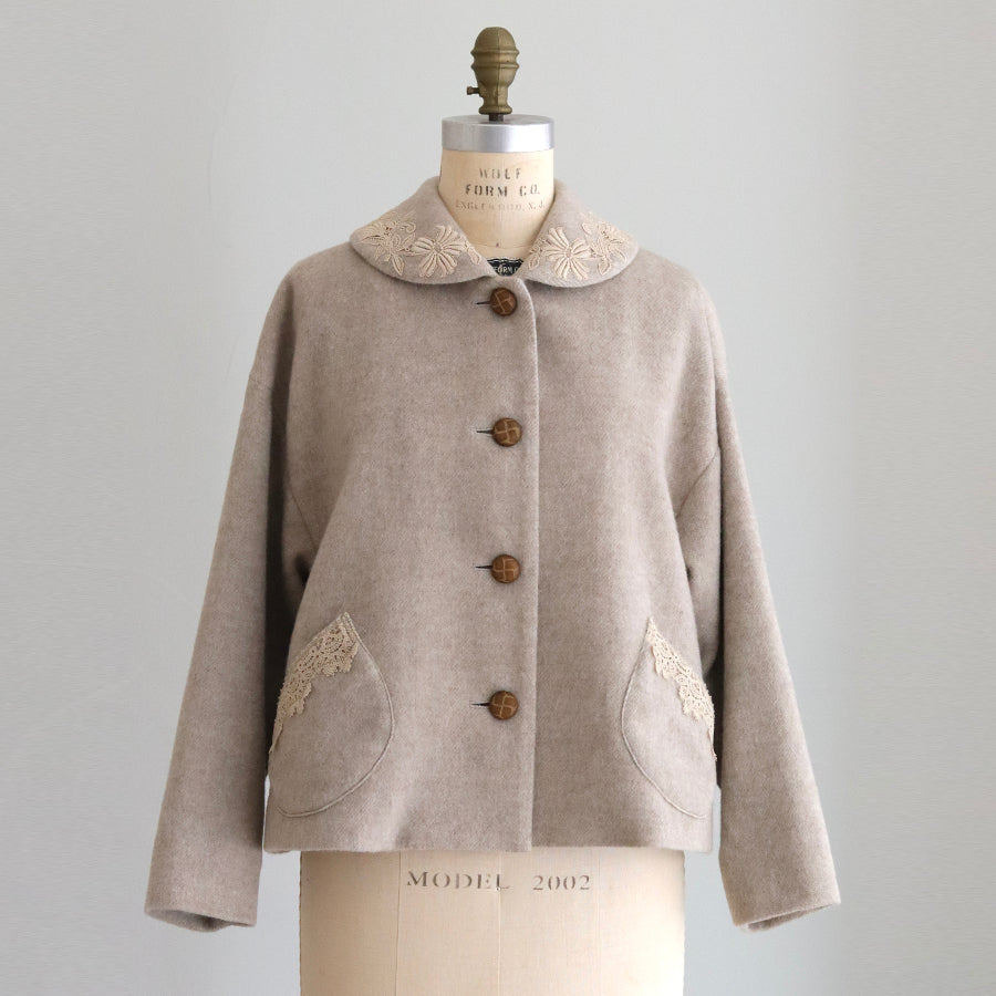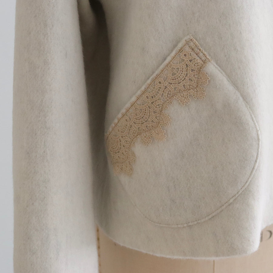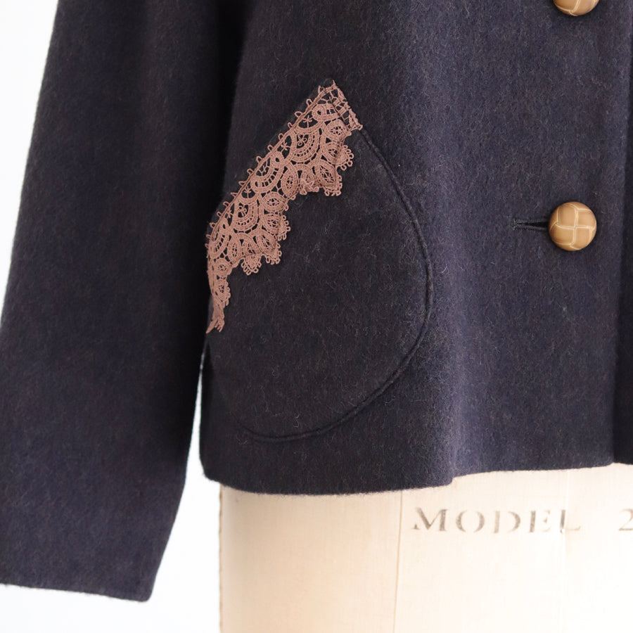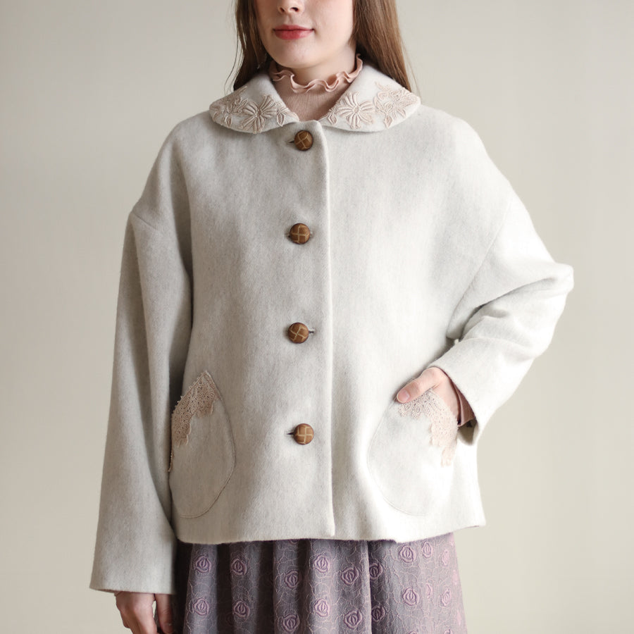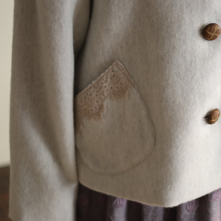 襟とポケットにレースを添えたやさしくナチュラルな印象のショートコートです。