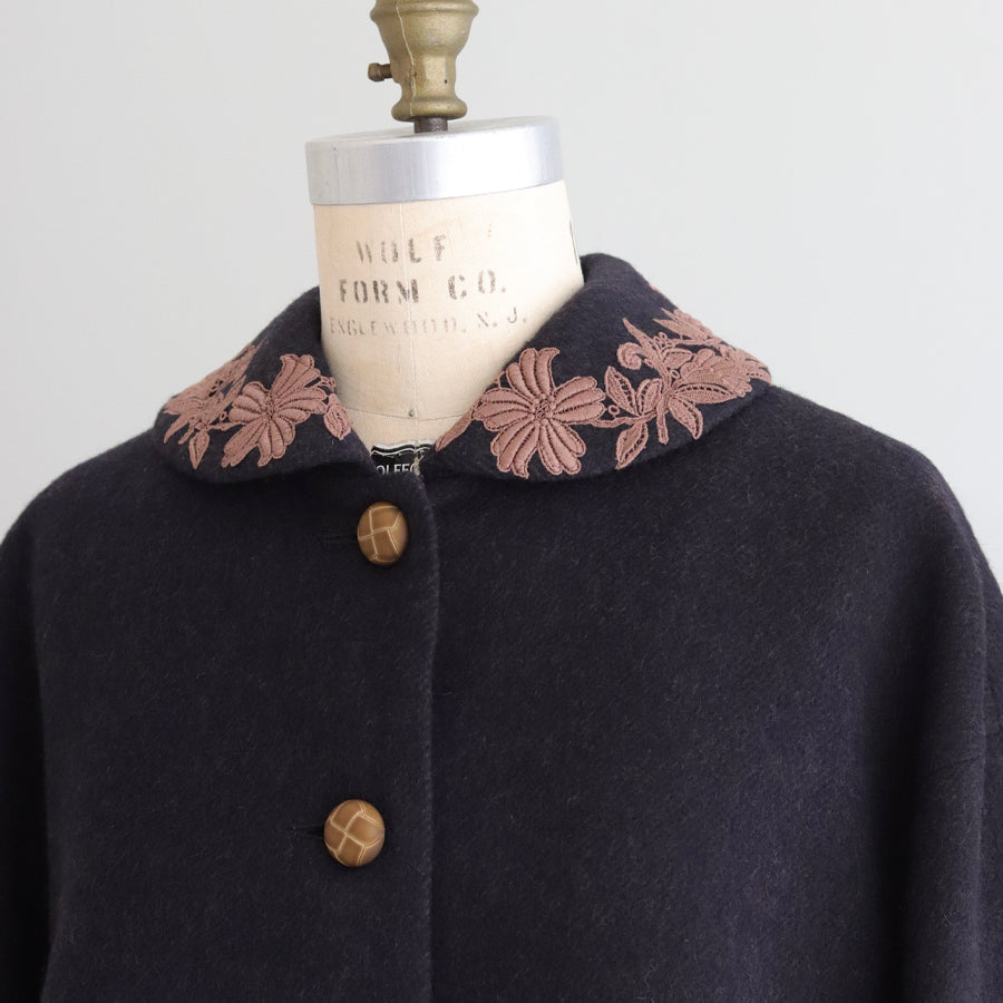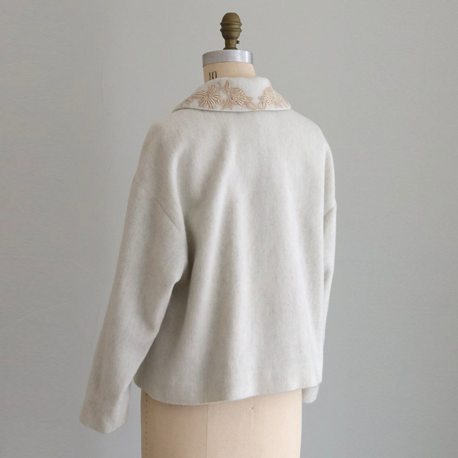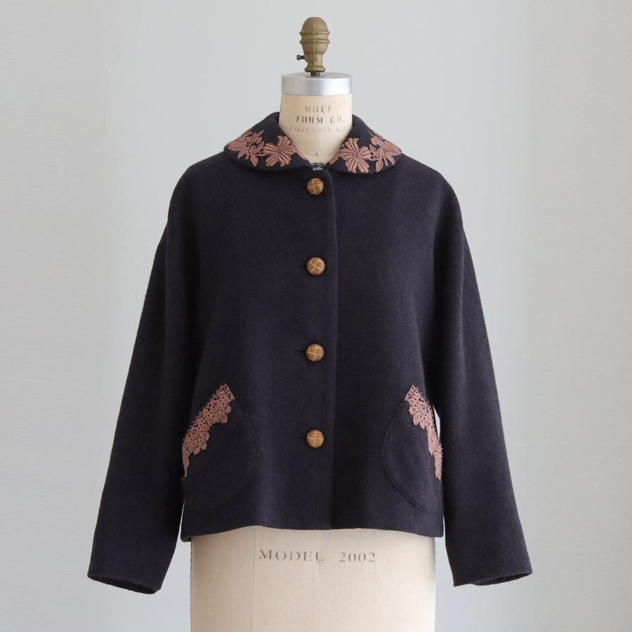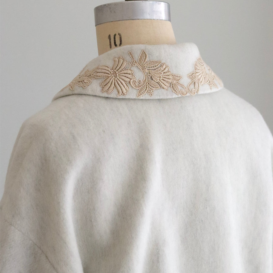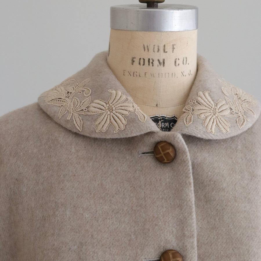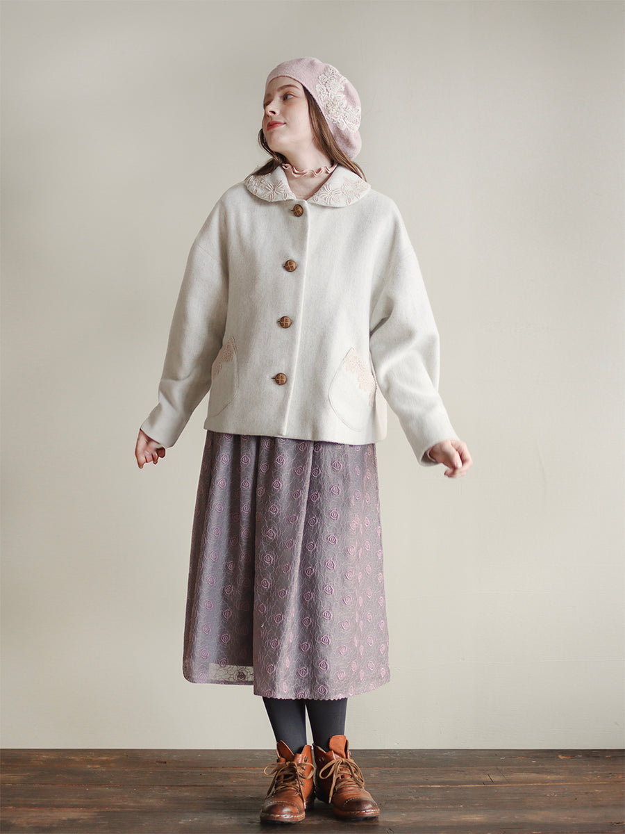 襟とポケットにレースを添えたやさしくナチュラルな印象のショートコートです。