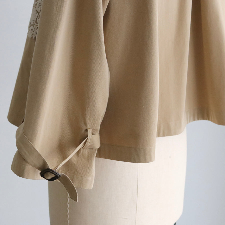 フレアスリーブには袖の形を変えられるようベルトがついており、カジュアルからフォーマルまで様々なシチュエーションに対応する一着です。