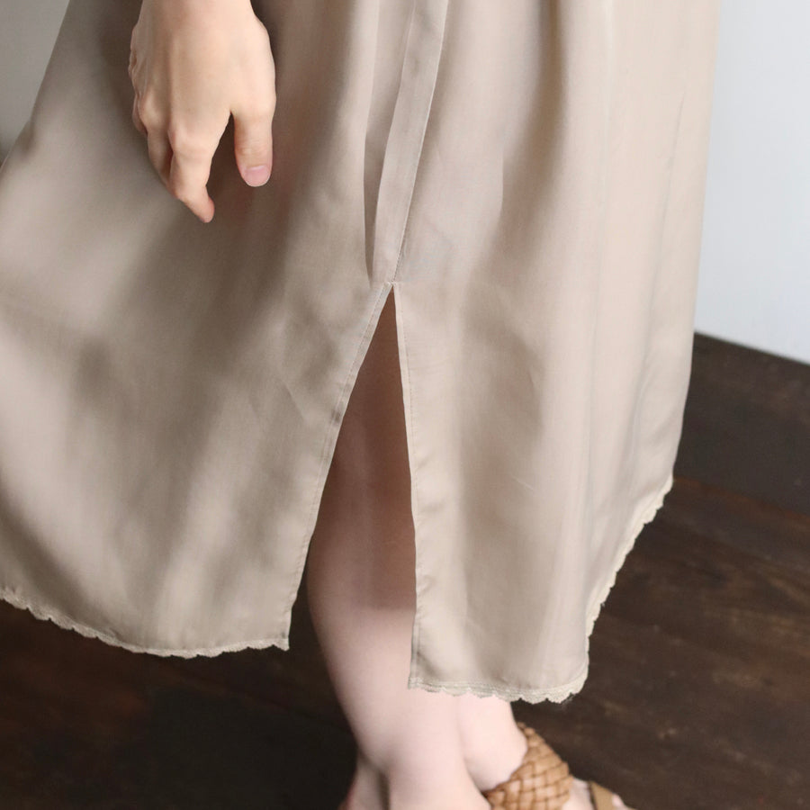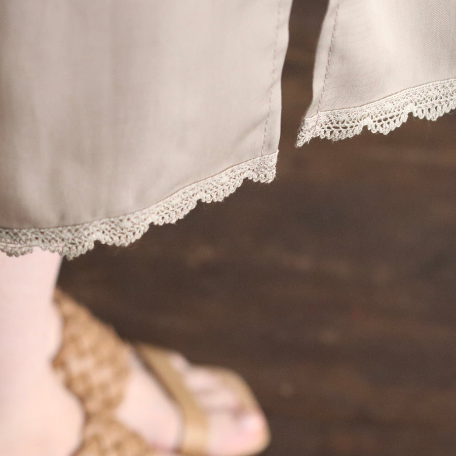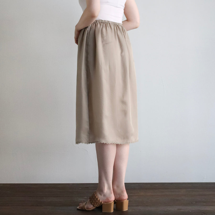 上質なキュプラ100%の素材でREIのインナースカートを作りました。サイドに深めのスリットを入れているので、スリット部分を前にすれば透け感のあるワイドパンツなどにもお使いいただけます。うっとりするほどなめらかで心地よい肌触り。裾にもレースを配置し、見えない部分もおしゃれに仕上げました。