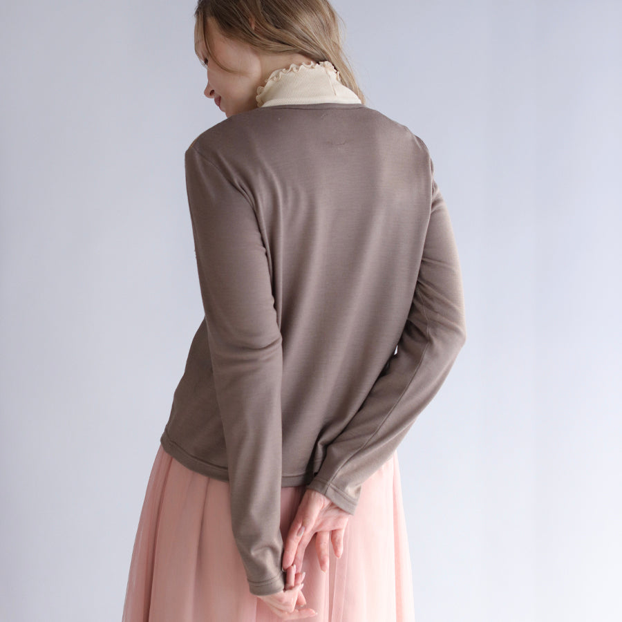 しっとりなめらかな肌触りのウール天竺素材で作ったカーディガン。