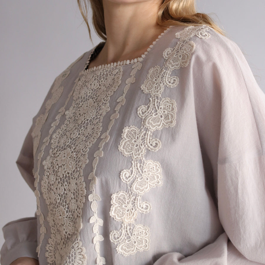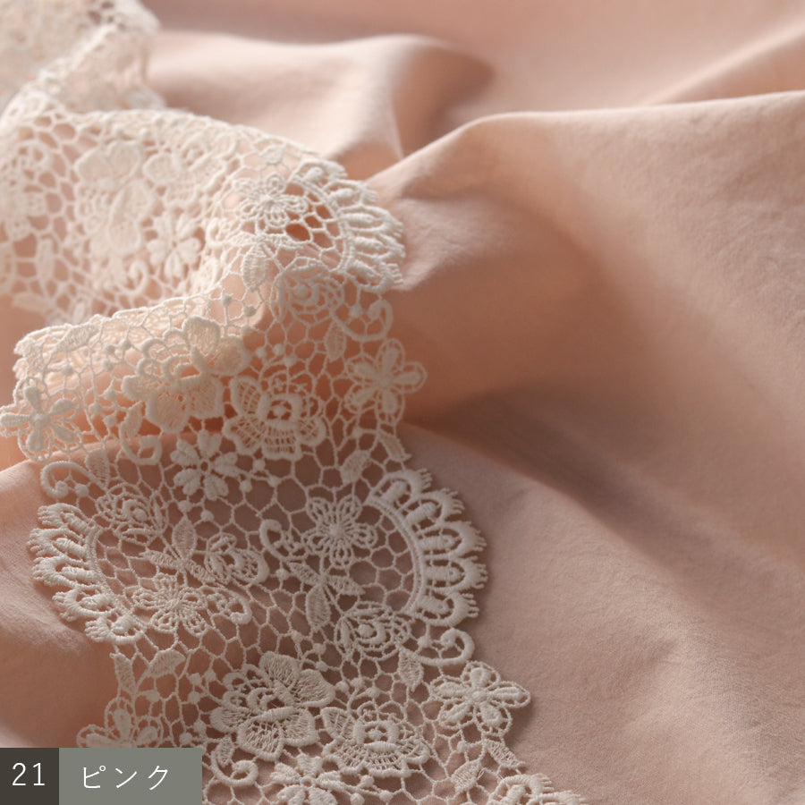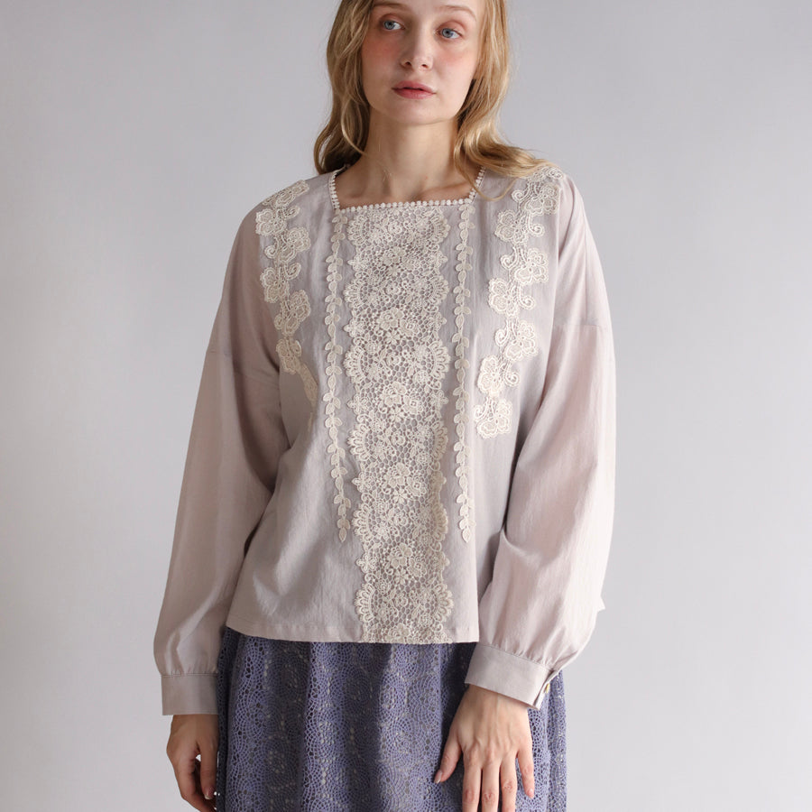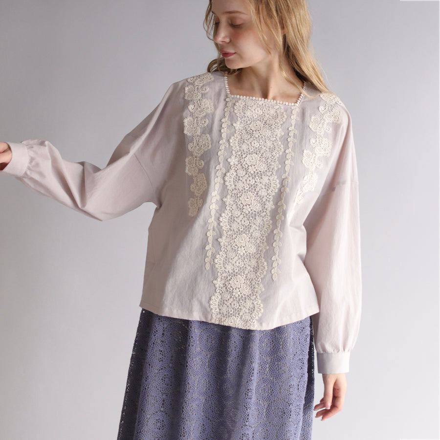 デコルテを美しく見せるスクエアネック。レースを贅沢に装飾し、クラシカルな華やかさを演出しました。